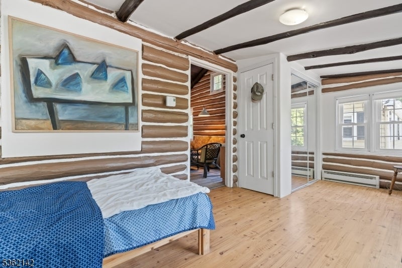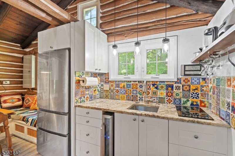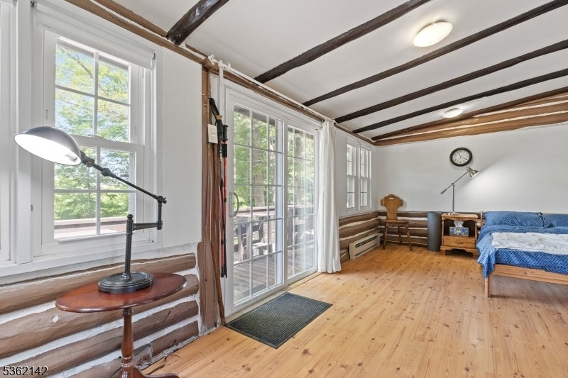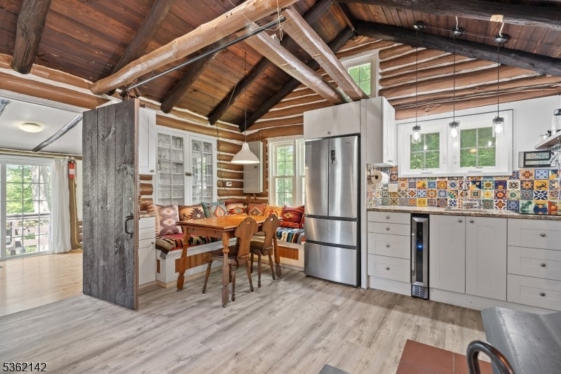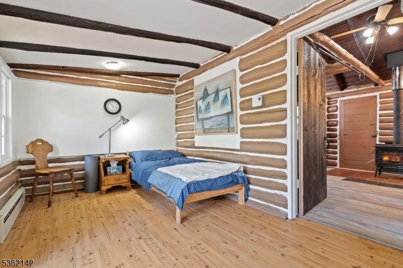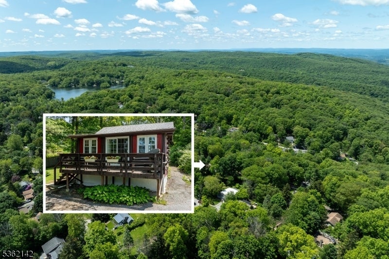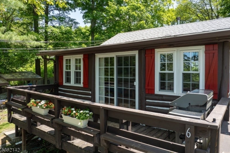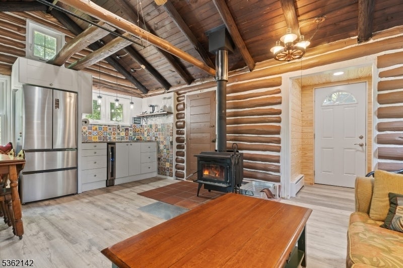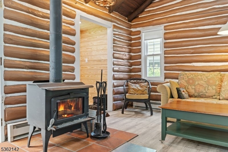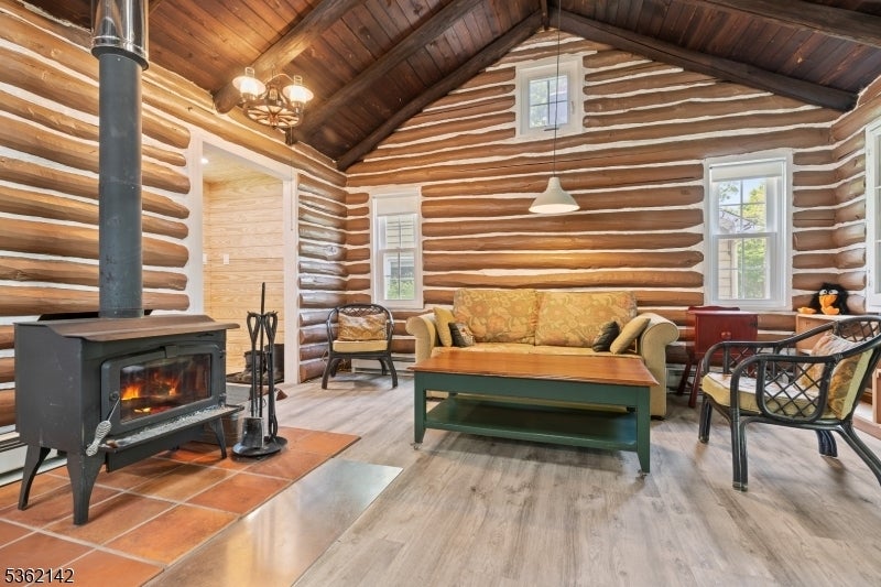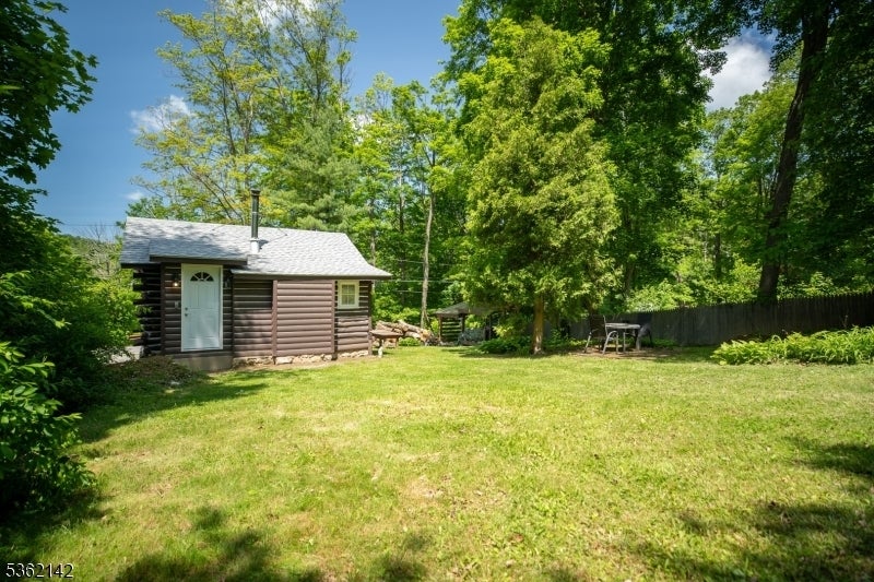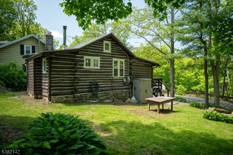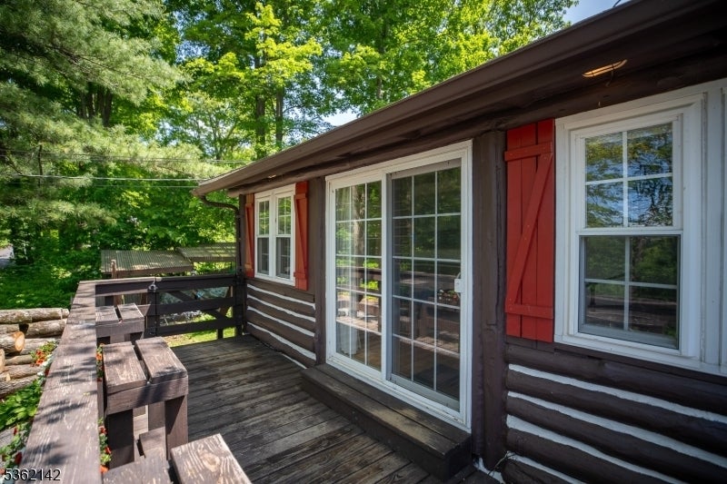 Wake up to dappled sunlight filtering through the tree canopy at this classic log cabin nestled on a .14-acre wooded lot. Available furnished and recently upgraded, the home marries storybook charm with modern efficiency: new roof 2025, 200-amp electric service 2022, on-demand hot water 2024, and a 140-ft deep well drilled in 2019. Step onto the west-facing front deck for morning coffee or golden-hour cocktails. Inside, exposed log walls and rafters frame an open living area anchored by a wood-burning stove and a clever built-in dinette. The sleek, renovated kitchen pairs an induction cooktop, stainless appliances, and a wine fridge with fresh flooring that carries into the chic bath with tiled shower. Recently replaced windows and doors boost energy performance. Outside, enjoy a stone patio with fire ring and off-street parking for two cars, plus a private backyard for pets or gardening. Enjoy outdoor recreation year-round with private access to Highland Lakes Country Club's five pristine lakes, seven sandy beaches. Activities for all interests and ages; sailing, racket sports, hiking, fishing, swimming and more. Winter sports are just a short drive away at Mountain Creek. Whether you crave a turnkey weekend hideaway or a low-maintenance full-time home less than 60 miles from NYC, this cabin delivers on atmosphere, amenities, and appeal. HOME IS SOLD AS IS: survey and septic engineering for a new system are available for the buyer to update.