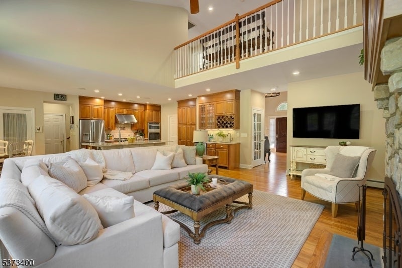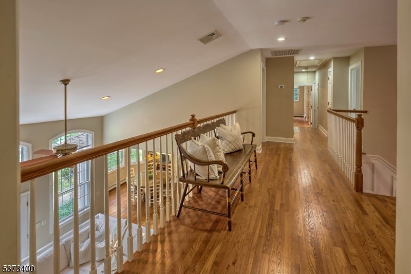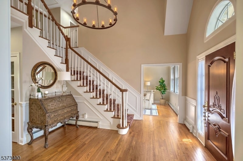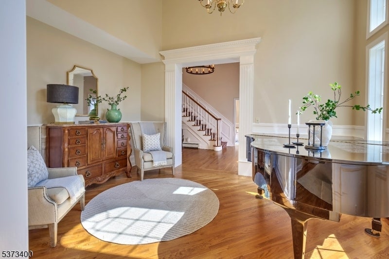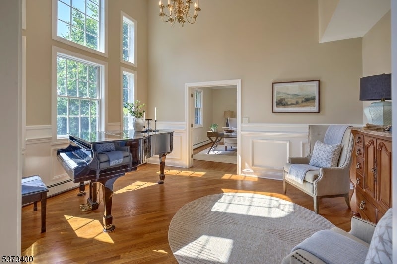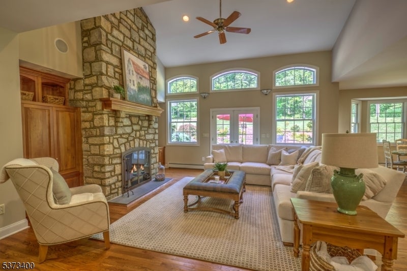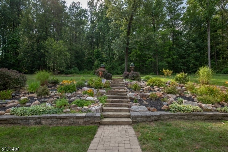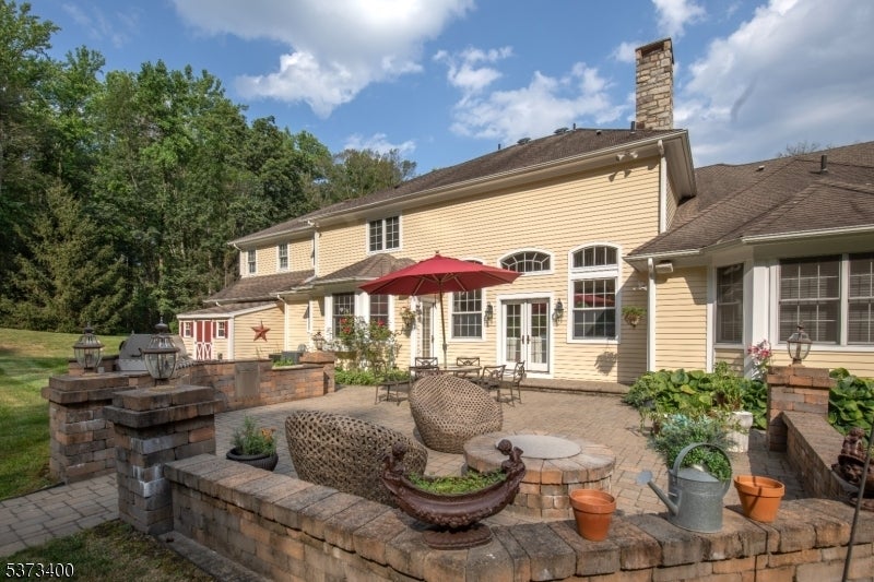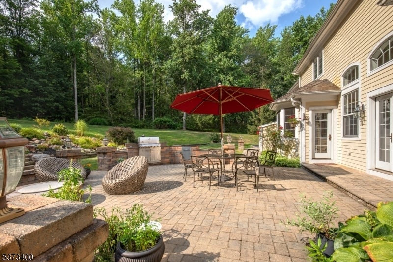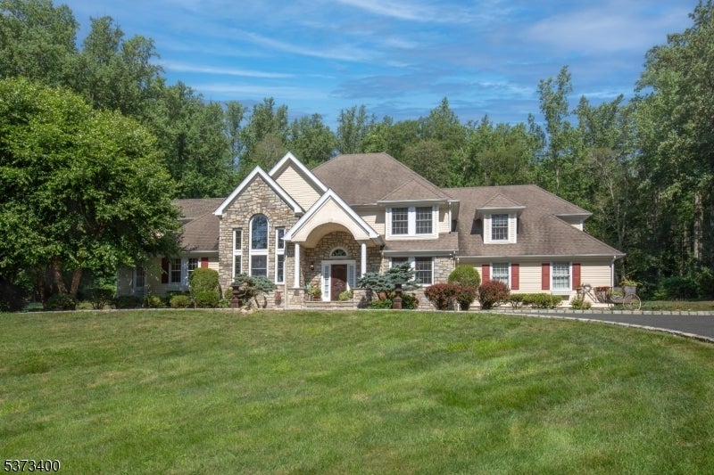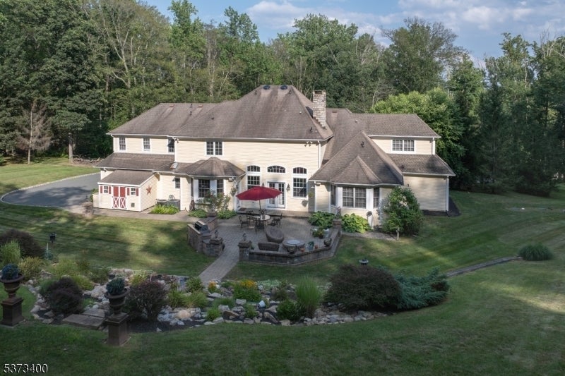 This stately Colonial sits atop a gentle rise in sought-after Harding Township, known for its top-rated schools and easy access to commuting routes. With timeless architecture and a thoughtful layout, this five-bedroom, four-and-a-half-bath home offers the perfect blend of luxury and comfort. Inside, soaring ceilings and extensive millwork elevate each space. Formal living and dining rooms are ideal for entertaining. The gourmet eat-in kitchen features premium appliances, custom cabinetry, a pantry, and a large island. It opens to a dramatic two-story family room with a floor-to-ceiling stone fireplace, custom built-ins, and a service bar with sink and beverage fridge. French doors and walls of windows connect both rooms to a beautifully landscaped patio and park-like yard. A private office connects to the primary suite. The first-floor primary suite includes a spa-style bath with radiant heat floors. A secondary staircase, powder room, and laundry room complete this level. Upstairs, two bedrooms are en-suite, and two more share a hall bath offering generous accommodations. The finished lower level provides a bar, media area, recreation space, and ample storage. Outside, enjoy a walled paver patio with a built-in grill and custom fire pit overlooking a manicured garden perfect for entertaining. A rare offering in a prestigious location that blends refined living with everyday ease.