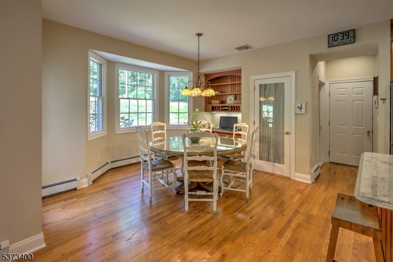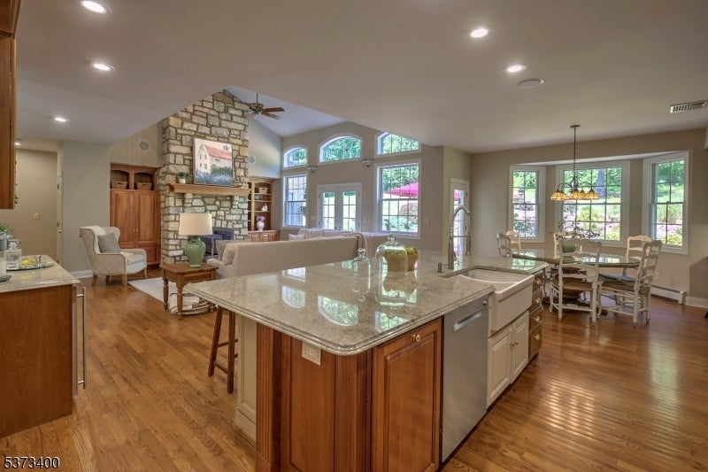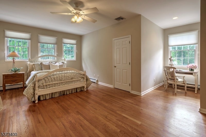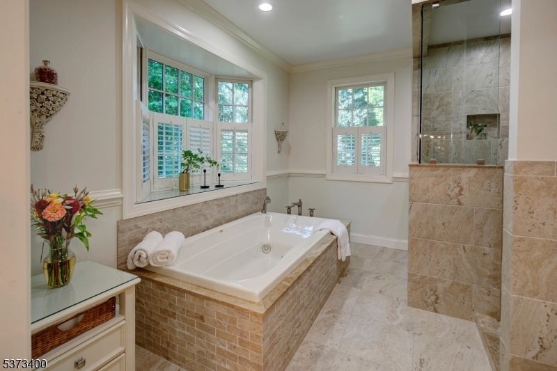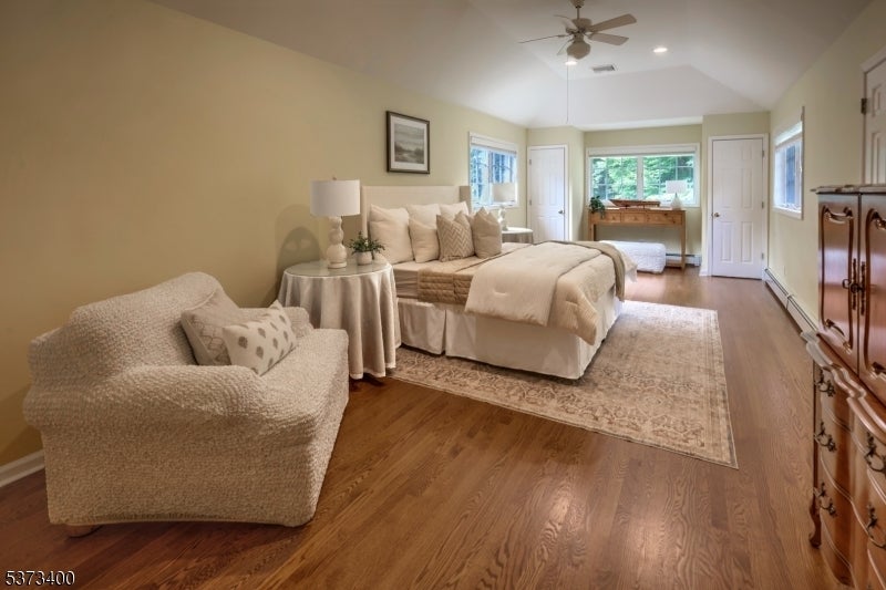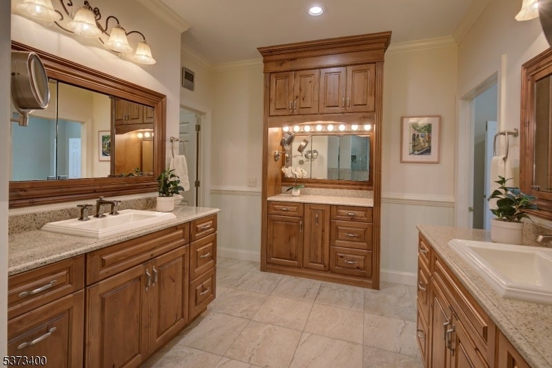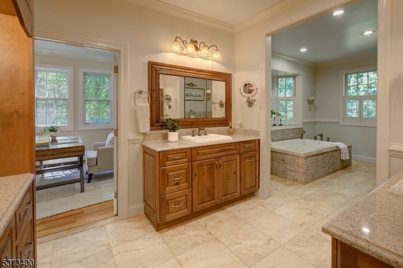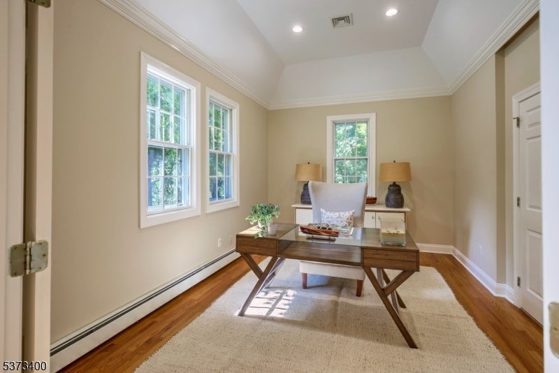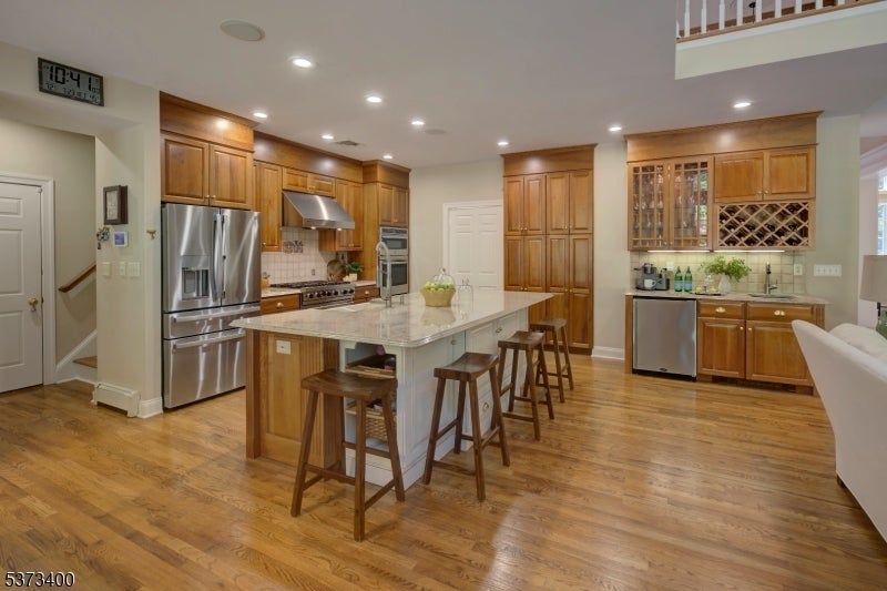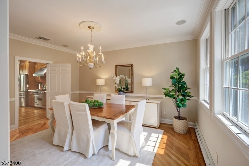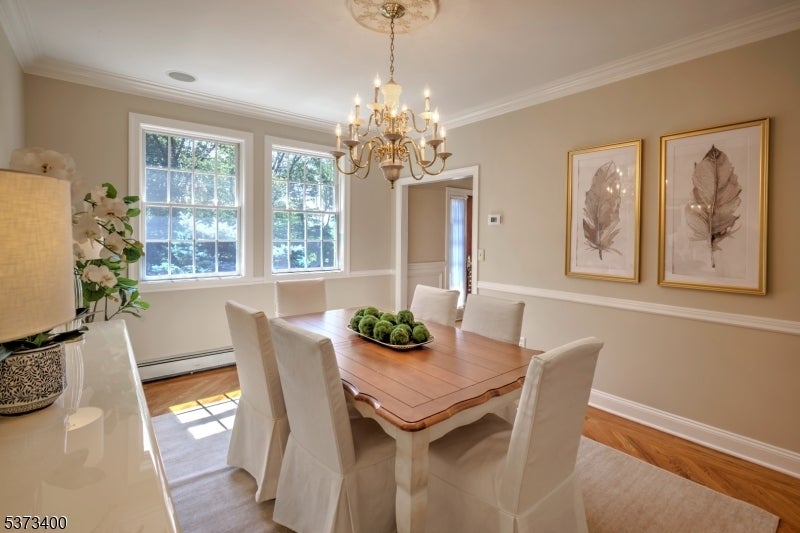 This stately Colonial sits atop a gentle rise in sought-after Harding Township, known for its top-rated schools and easy access to commuting routes. With timeless architecture and a thoughtful layout, this five-bedroom, four-and-a-half-bath home offers the perfect blend of luxury and comfort. Inside, soaring ceilings and extensive millwork elevate each space. Formal living and dining rooms are ideal for entertaining. The gourmet eat-in kitchen features premium appliances, custom cabinetry, a pantry, and a large island. It opens to a dramatic two-story family room with a floor-to-ceiling stone fireplace, custom built-ins, and a service bar with sink and beverage fridge. French doors and walls of windows connect both rooms to a beautifully landscaped patio and park-like yard. A private office connects to the primary suite. The first-floor primary suite includes a spa-style bath with radiant heat floors. A secondary staircase, powder room, and laundry room complete this level. Upstairs, two bedrooms are en-suite, and two more share a hall bath offering generous accommodations. The finished lower level provides a bar, media area, recreation space, and ample storage. Outside, enjoy a walled paver patio with a built-in grill and custom fire pit overlooking a manicured garden perfect for entertaining. A rare offering in a prestigious location that blends refined living with everyday ease.