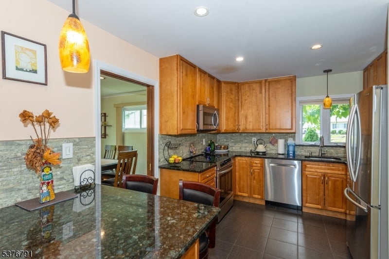 Welcome to your charming split-level home, ideally located near the highly sought-after Fallon Elementary School. Nestled in a tranquil, picturesque neighborhood, this beautifully maintained single-family residence offers exceptional curb appeal and a warm, inviting atmosphere. Step inside to discover a bright and spacious interior featuring gleaming hardwood floors throughout. The ground level includes a versatile bedroom, a full bathroom, a bonus family room, and a one-car garage equipped with a 240V outlet - perfect for charging your electric vehicle. Upstairs, the main living area boasts an updated kitchen with stainless steel appliances, an induction stove, and granite countertops, dedicated dining area, and a sun-drenched living room, ideal for both relaxation and entertaining. The upper level offers three additional bedrooms and a fully remodeled bathroom. Brand new roof installed in October 2025. The finished basement includes a laundry/utility room with abundant storage space. Step outside to your own private backyard oasis a lush, serene retreat featuring an in-ground pool, perfect for entertaining. Commuters will appreciate the NYC bus stop just down the street, with schools, shopping, dining, and transportation options all within close reach.