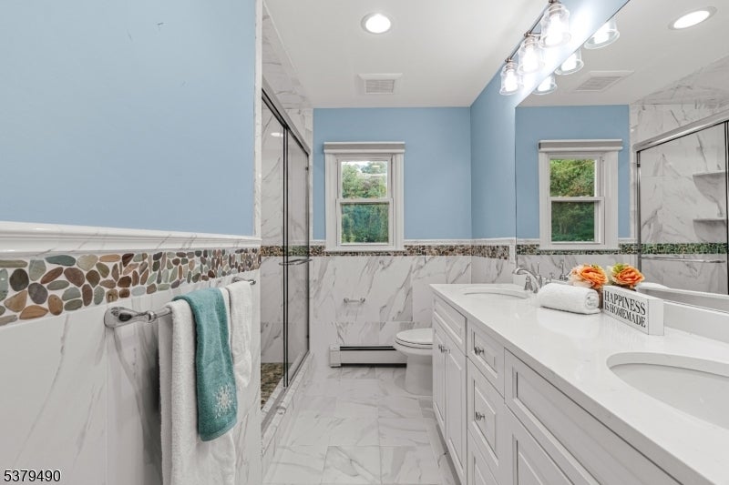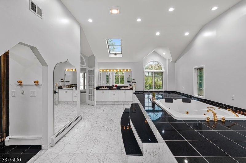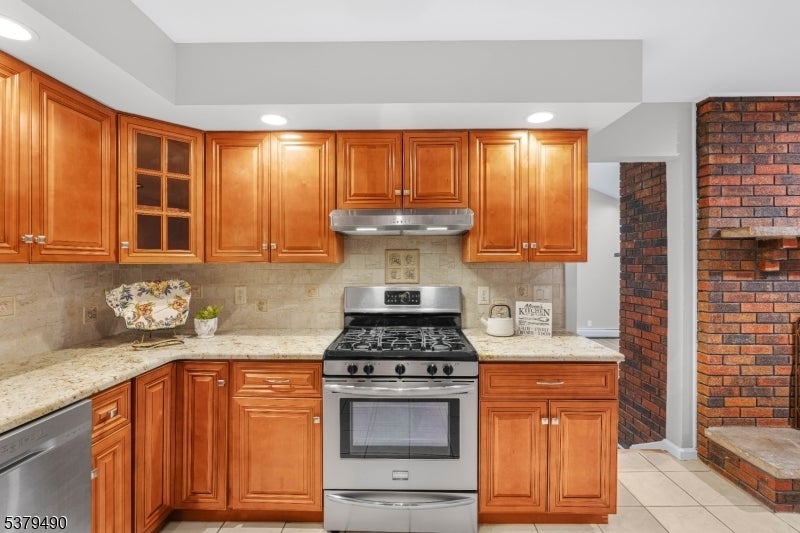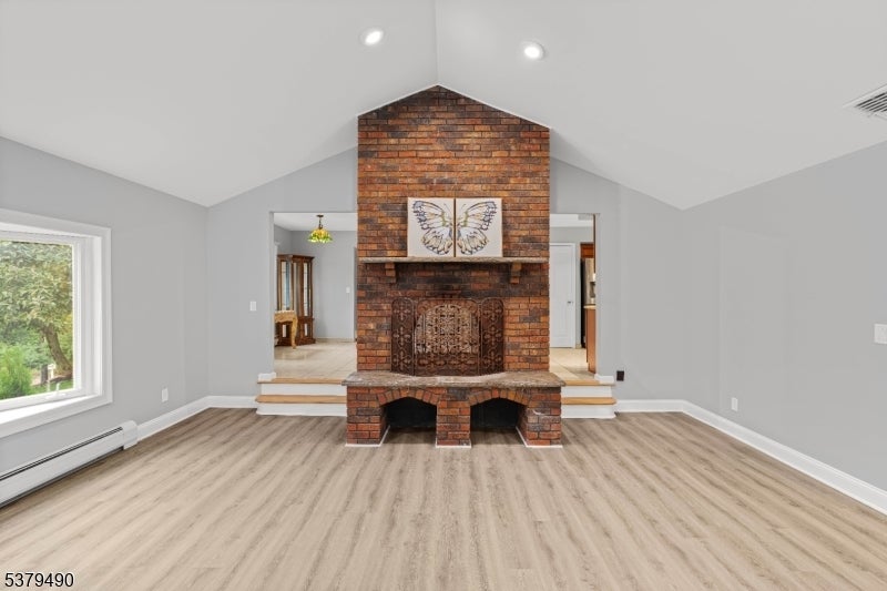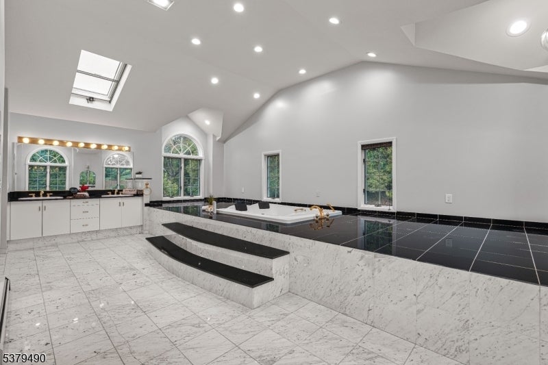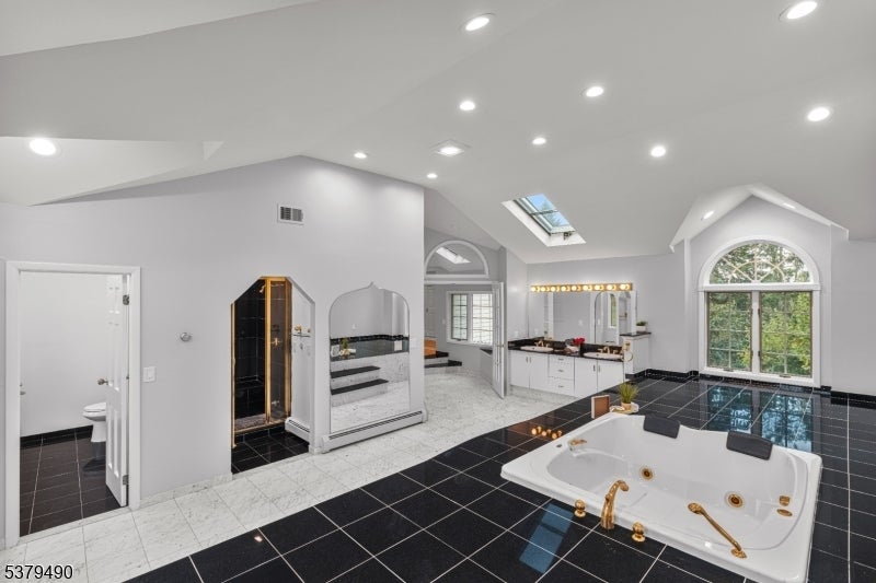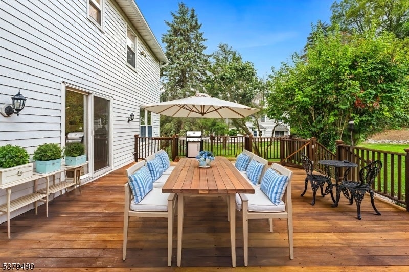Welcome to this beautifully maintained corner-lot home in sought-after Hawthorne, NJ, offering timeless curb appeal, a circular driveway, and stunning NYC skyline views. Limestone steps and fresh landscaping set the tone for this move-in-ready residence. Inside, enjoy a bright, open layout bursting with 2025 Upgrades: Refinished hardwood floors, fresh paint, modern light fixtures, recess lights, updated bathrooms and much more. The spacious living room flows into an eat-in kitchen with granite counters, wood cabinetry, & chandelier lighting. A rare double-sided brick fireplace connects the kitchen & sunken family room, featuring vaulted ceilings, bay windows, brand-new vinyl flooring (2025), recessed lighting, and an updated powder room with access to laundry, garage, and side entry. A formal dining room w/ a modern chandelier opens to a refinished 20x20 deck perfect for entertaining.Upstairs, find four generous bedrooms and two updated baths (2021). The oversized primary suite offers 2 walk-in closets and a spa-like retreat: Jacuzzi tub, dual vanity, powder room, and separate shower. The finished basement adds a recreation area with bar, stage, & mini dance floor. Updates include a new water heater (2025), roof (5-6 yrs), and all-new recessed lighting. With baseboard heating, central AC, sprinkler sys & stylish upgrades, this home blends comfort, character, and convenience near schools, NYC transportation, shopping, dining, and Goffle Brook Park. Schedule your showing today!