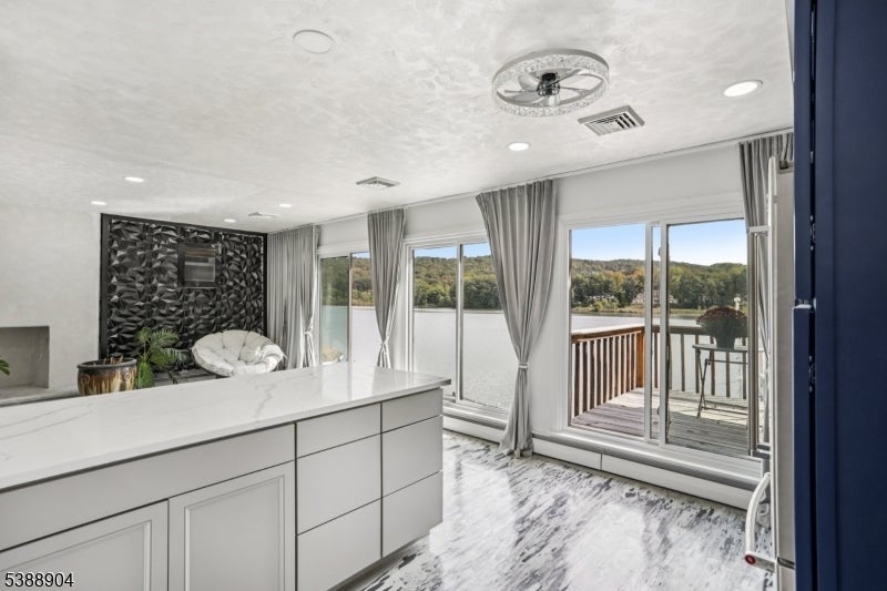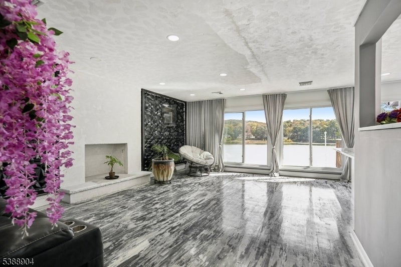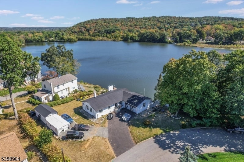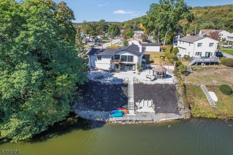 Welcome home to this exceptional 3 bedroom, 2 bathroom open concept Ranch, nestled on an oversized corner lot with what might be the best panoramic lake views in town! Step inside the welcoming foyer and into the stunning living room, where soaring ceilings, wood-burning fireplace, and floor-to-ceiling windows showcase the lake in all its beauty, creating an ambiance of serenity. The open flow continues into the designer kitchen, featuring custom cabinetry, quartz countertops, a stylish backsplash, pantry, and center island with seating. Sliding glass doors extend your living space outdoors to the deck perfect for entertaining or savoring peaceful mornings surrounded by nature. Down the hall, the home offers a spacious primary bedroom with a large closet and opportunity for an en suite, while two additional bedrooms and a full bath complete the level. The full finished walkout basement boasting kitchenette, full bath, family room with soaring ceilings, second fireplace, and bar all framed by breathtaking lake views. Glass doors lead to the patio, gazebo, and fire pit, inviting evenings of relaxation and conversation.Stairs lead down to the water's edge, with the option to add a floating dock for boating, kayaking, or swimming. With a two-car attached garage, detached garage/shed, and ample parking, this residence blends luxury and convenience. Just moments from NYC transportation, shopping, and dining, this home offers an unmatched lifestyle of refined lakefront living.