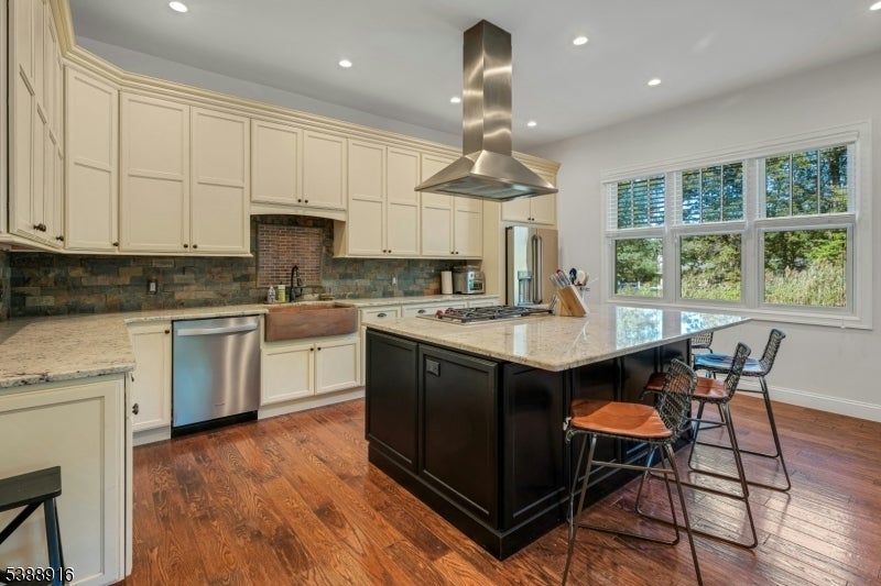 What a find...true no step ranch, beautifully updated, fabulous granite & stainless steel Chef's kitchen with walk-in pantry, a 'wow' center island breakfast bar, stone backsplash & copper farmers sink. Entertain with flair in the formal living rm w/fp and open concept dining rm with french door access to an oversized deck and patio overlooking a very private rear yard. The master bedroom private wing features master bedroom, fully outfitted walk-in closet, stunning master bath with soaking tub, double sink vanity and marble tiled master shower & bedroom 2/office. Additional 2 bedrooms, updated hallway bath, laundry room and mud room alcove plus garage access are located at the main level as well. The finished lower level features recreation room, playroom exercise area, office alcove, utility room & additional storage room with shelving plus an impressive 8' x 10' custom built, temperature controlled wine cellar closet. Neutral decor & updated throughout. Make this lovely home yours today!