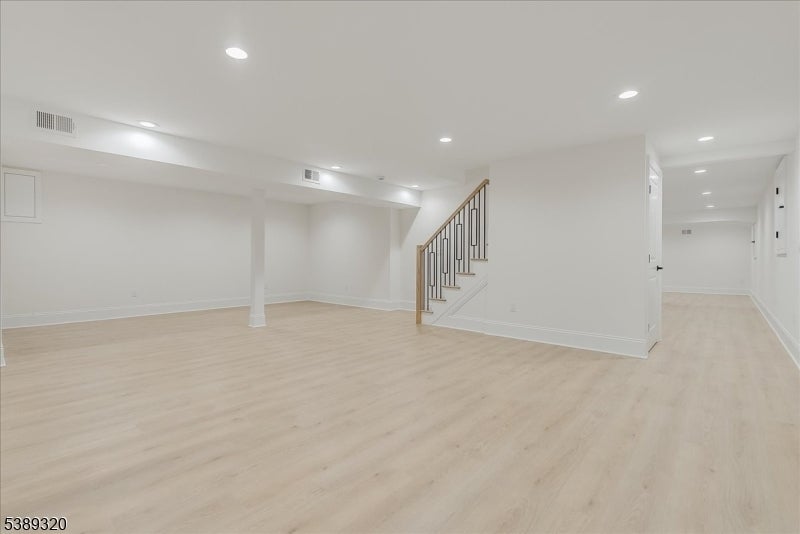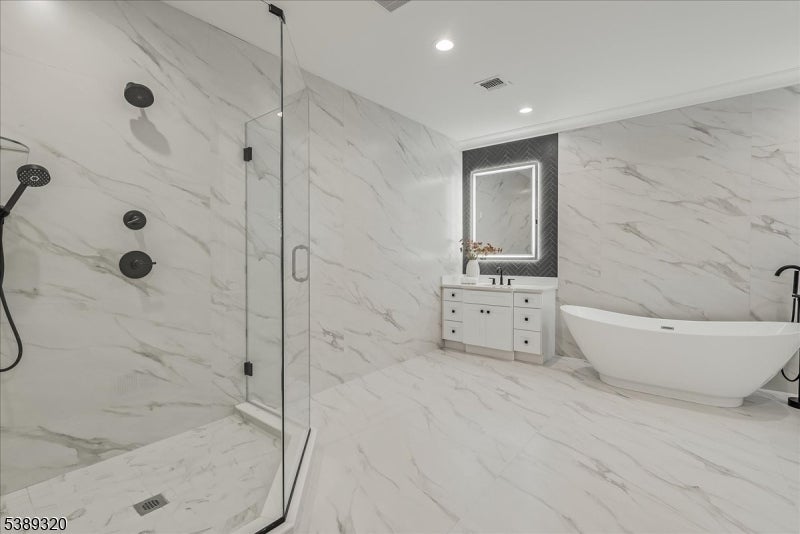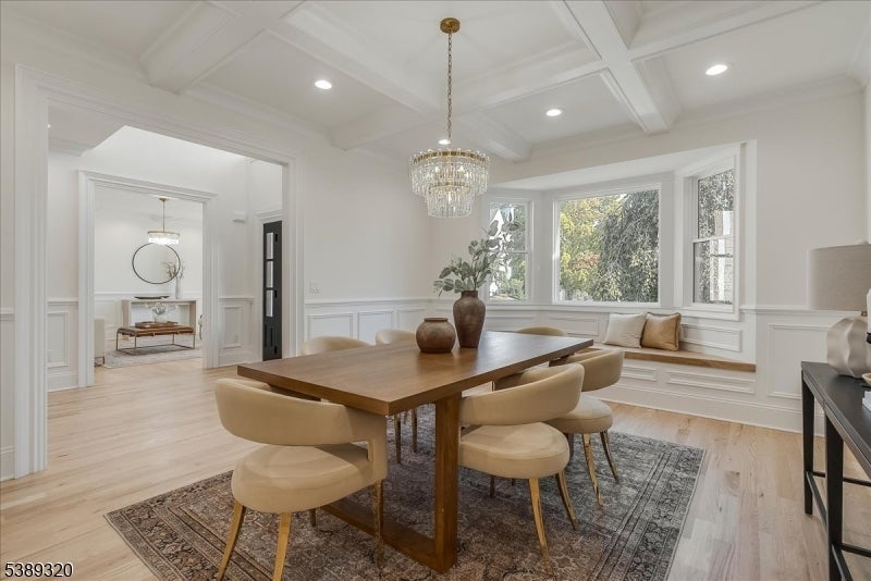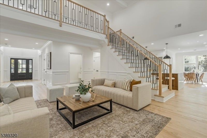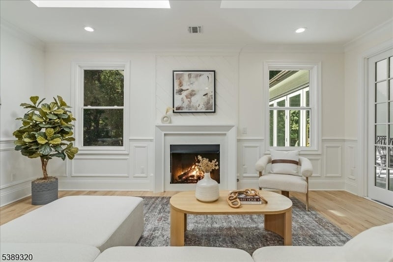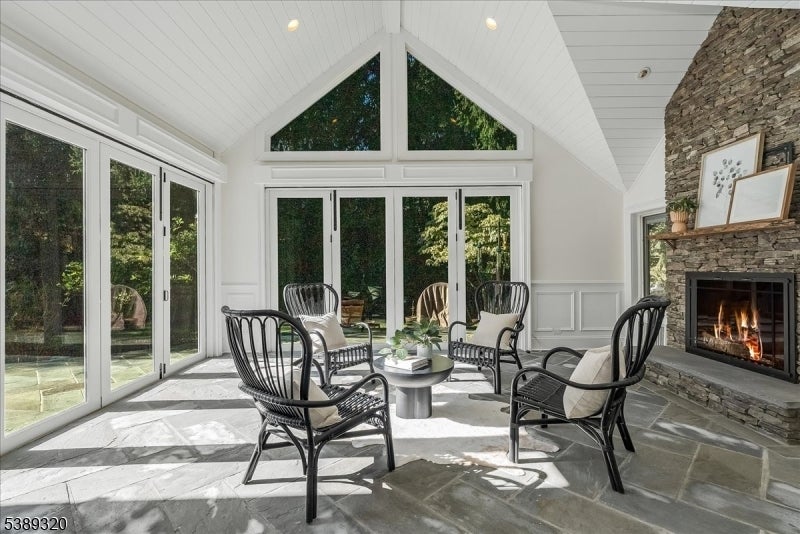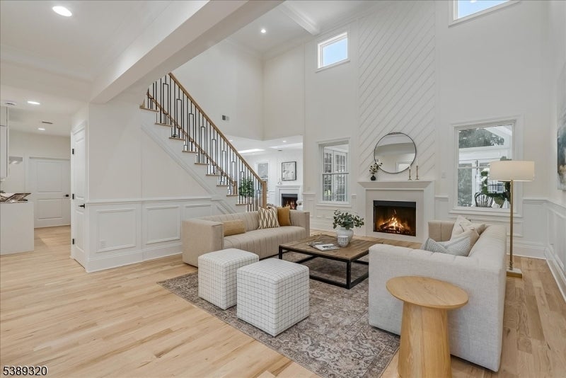 Set within the Grande at Pleasantdale, this meticulously redesigned residence blends timeless architecture with a sophisticated modern aesthetic. A striking exterior of cedar shake siding, brick detailing, and architectural windows sets the tone for the elegance within. Step inside to a light-filled interior showcasing wide-plank white oak flooring, custom millwork, and designer lighting throughout. The formal living and dining rooms exude refinement with coffered ceilings, wainscoting, and large picture windows that fill the home with natural light. At the heart of the home lies a two-story great room with a floor-to-ceiling fireplace and OPEN Sightlines to the chef's kitchen complete with a waterfall island, quartz counters, professional-grade appliances, and a breakfast area overlooking the lush backyard. Off the kitchen, a sun-drenched vaulted sitting room framed by a dramatic stone fireplace features an expansive wall of sliding glass doors that fully retract, creating a seamless indoor-outdoor flow to the yard and patio perfect for al fresco entertaining. The primary suite offers a spa-inspired bath with floor-to-ceiling porcelain tile, a freestanding tub, rainfall shower, and LED-lit vanity wall. Outside, a custom stone patio and outdoor kitchen are surrounded by mature landscaping, offering privacy and serenity. Ideally located by parks, shopping and mass transportation to NYC
