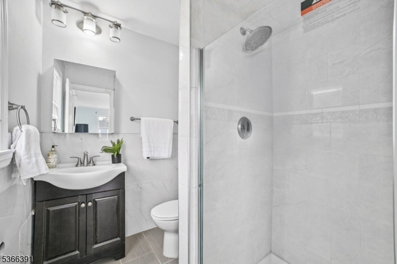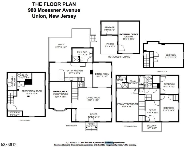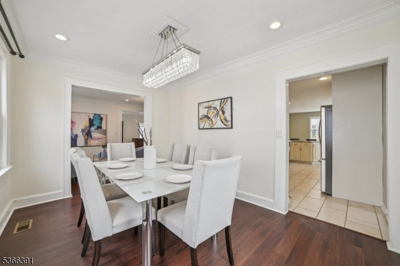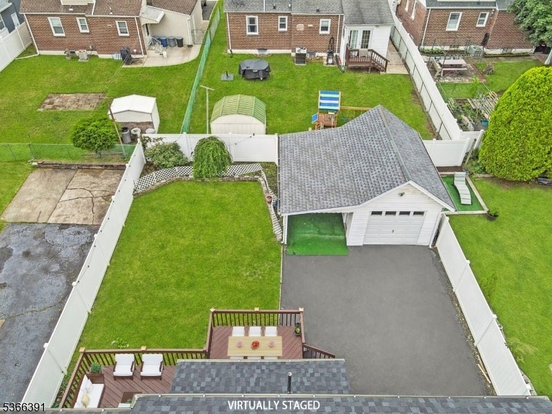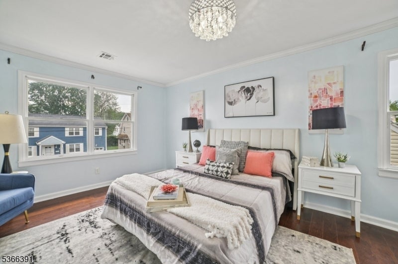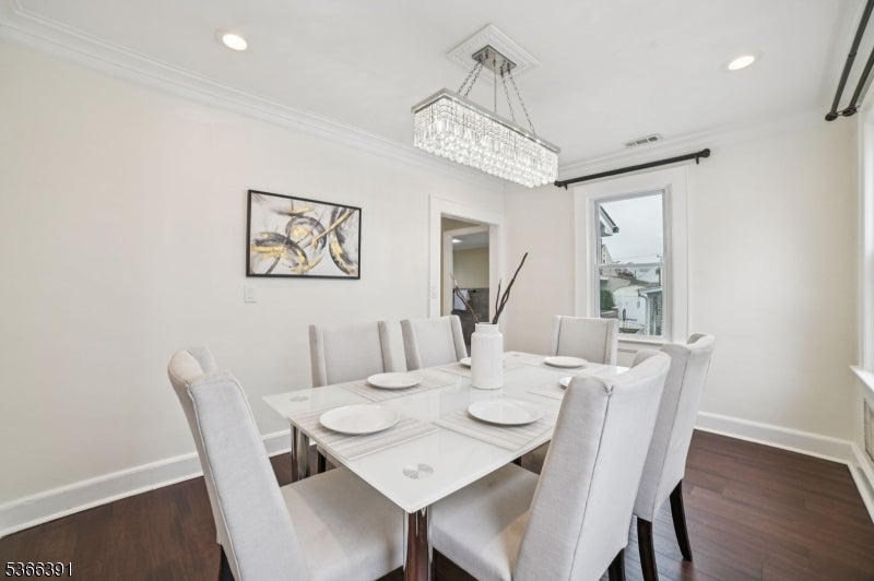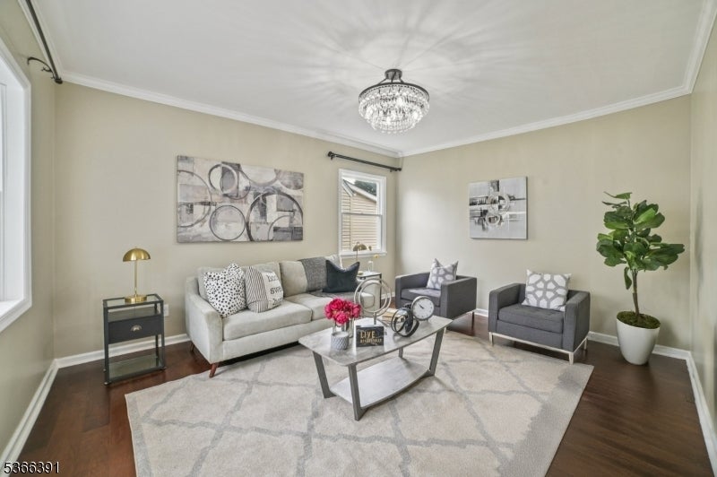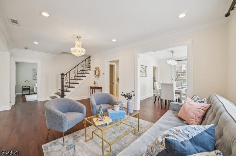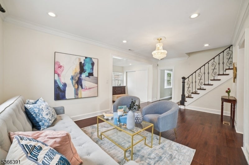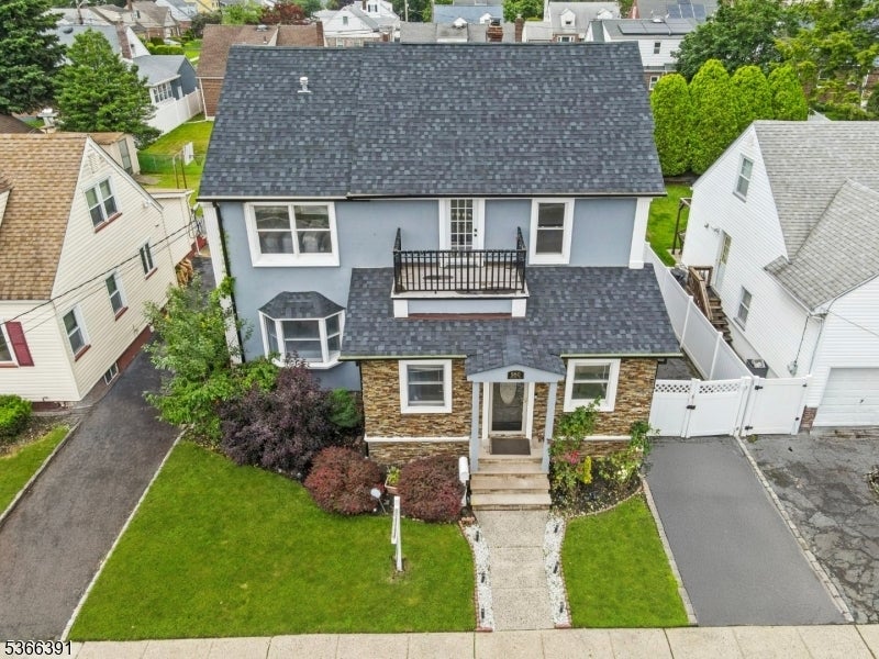 Custom-built colonial with 5 bedrooms and 3 full baths. Approx. 2,700 sq ft of living space, EN SUITE plus finished basement. Newer h/w floors, plumbing, electrical, roof, recessed lighting, and two-zone C/A and heating. The ground level has an oversized bedroom, currently used as a family room, plus a full bath, ideal for folks avoiding the stairs. The kitchen features granite countertops, SS/A , and soft-close 42-inch cabinets with crown molding. The stone tile backsplash, under-mount sink, gas range, refrigerator, and breakfast bar are anchored by custom mill work. Kitchen opens to an expansive deck with picturesque views of the landscaped backyard. Living and dining rooms are formal. The chandelier in the dining room is elegantly suspended with rows of cascading crystals and prisms, while a wrought iron staircase with dark wood treads adds charm and character to the living room. On entry you will find a spacious foyer for welcoming guests or casual entertainment. Level 1 features the 2nd, 3rd, and 4th bedrooms, including the primary suite with private bath and walk-in closet. This level also offers a formal office with balcony and skyline views. A 3rd full bath includes a spa-style tub and shower adding a touch of luxury. Level 2 includes the 5th b/r with ample closet space. Other features: finished basement, laundry room, detached office/gym, privacy fence, parking for 4. Proximity to NYC buses, EWR A/port, major highways, and Whole Foods.