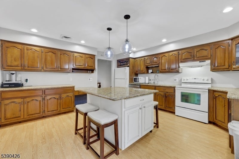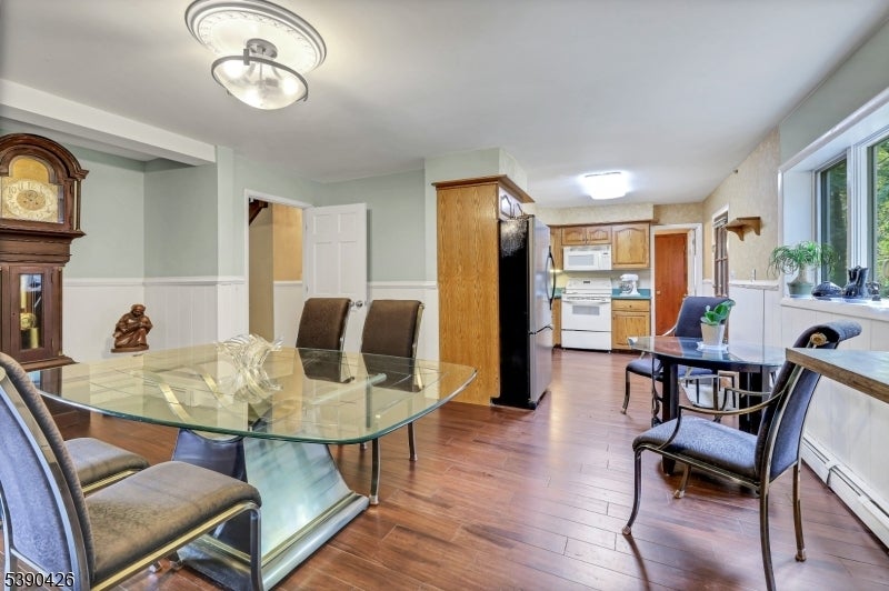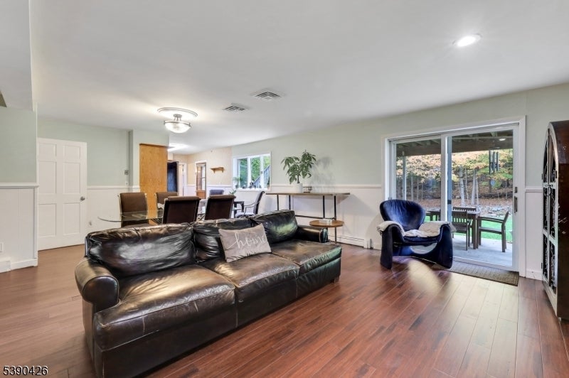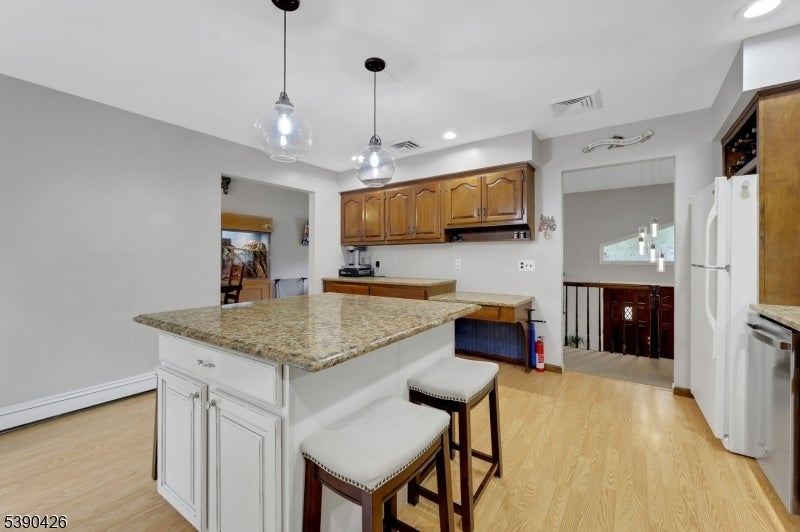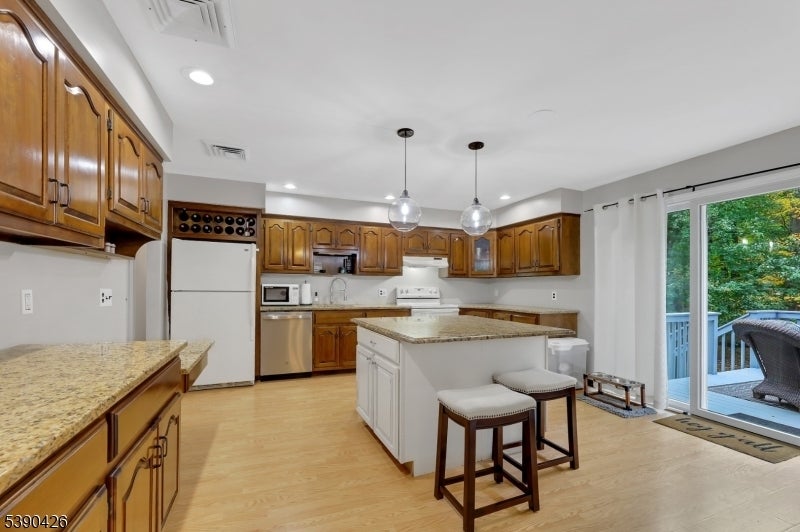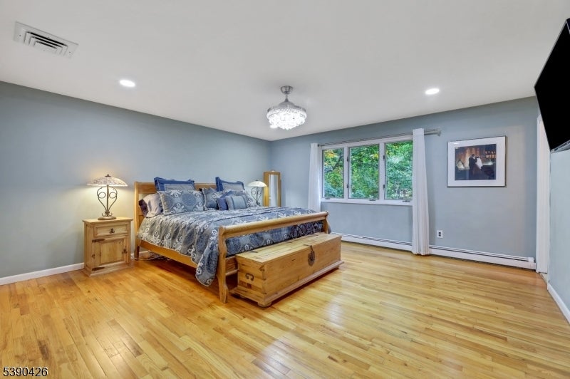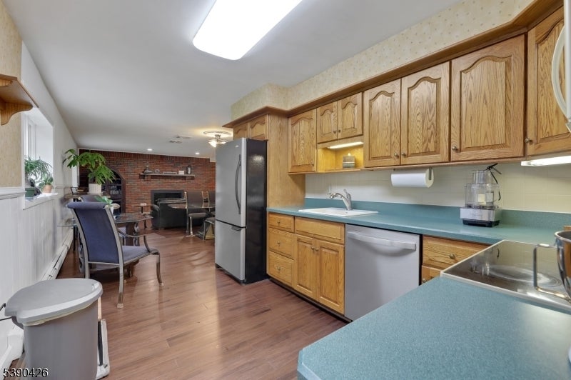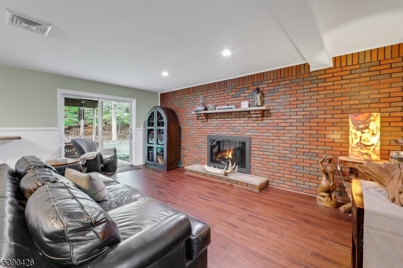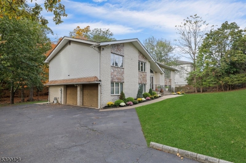 Sitting in a picturesque desirable neighborhood, this lovely brick and stone faced oversize bilevel home has amazing curb appeal and offers an ideal floor plan for daily enjoyment and entertaining. The main level features an enormous kitchen with abundant cabinet space, stainless steel appliances, center island and opens directly to a deck with a view of privately owned woodlands: perfect for indoor/outdoor gatherings. A dining room accommodates holiday gatherings easily, flowing into a comfortable sunlit living room. An expansive primary suite offers a private bath, generous closet space, stunning light fixture with retractable ceiling fan and flat-screen wall TV. Two more bedrooms have large closets and ceiling fans, as well. The ground level offers two separate storage areas, laundry room, summer kitchen, large recreation room with a brick-faced wall and fireplace, full bathroom and an additional bedroom ideal for guests or extended living. There's a separate entrance from the summer kitchen, plus additional grade level access via sliders to a concrete patio. The huge two-car garage includes a separate workshop or contractor's office. Sprinkler system, generator hookup and new central air offer additional value. A well-maintained home, coupled with an ideal location -- one the prettiest neighborhoods in the popular community of North Haledon -- make this a stellar opportunity you don't want to miss.