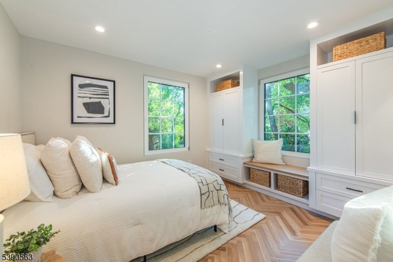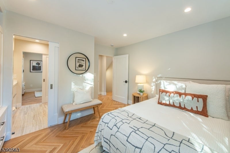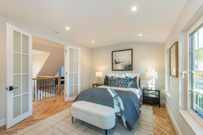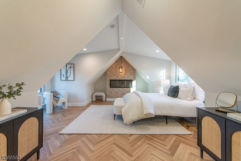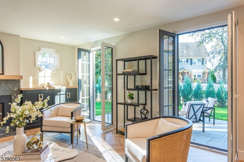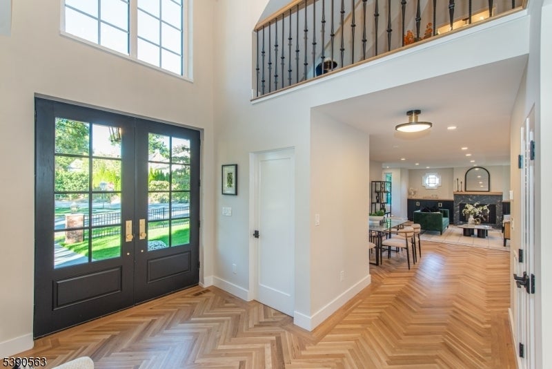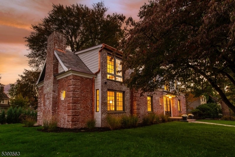 Step into timeless elegance with this exceptional residence, nestled in a tranquil neighborhood offering walkability to vibrant downtown Montclair and effortless NYC commute. With the feel of a modern French Chateau, the home blends classic refinement with contemporary luxury. A dramatic two-story foyer welcomes you with an oversized entrance door, curated lighting, and soaring windows that glow at dusk. It features five bedrooms, four full baths and a first-floor powder room. White oak herringbone flooring flows throughout, complementing a bespoke kitchen with custom white oak cabinetry, Calacatta quartz countertops, GE Cafe appliances, and a walk-in pantry. The primary suite is a sanctuary with a spa-inspired bath featuring a walk-in shower for two, rich finishes, a soaking tub, a smart toilet, and a cleverly designed closet. A second-floor loft offers a serene retreat, while the upstairs bedroom is an architectural gem with peaked ceilings, is ideal for a private suite. Distinctive fireplaces, custom built-ins, and refined finishes lend uniqueness to every room. The inviting family room features a custom built-in wet bar, full bath, and dedicated laundry room. From the living rm and kitchen, 3 elegant French doors open to stone patio, curated gardens, newly planted evergreens, and enchanting exterior lighting, perfect for relaxing, watching the seasons change, or entertaining al fresco. This residence is a rare blend of sophistication, serenity, and luxurious living.