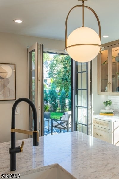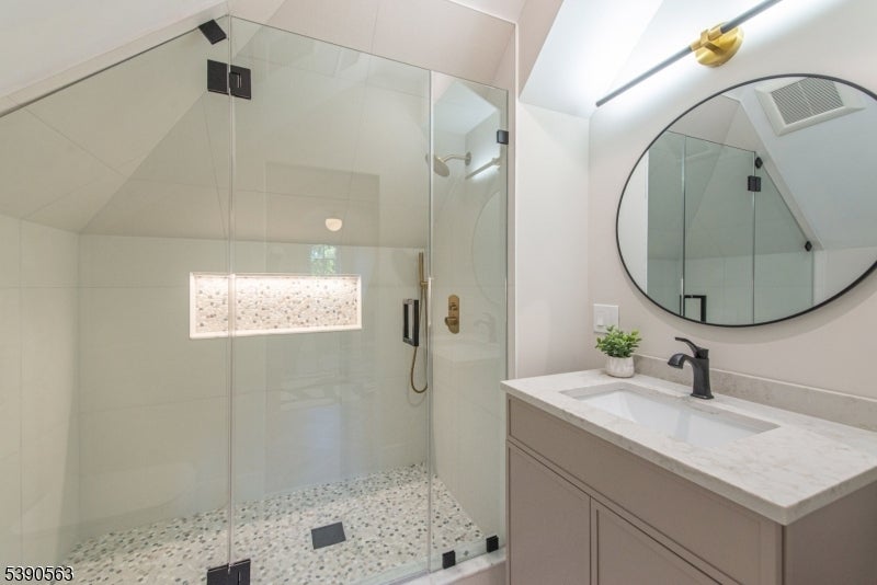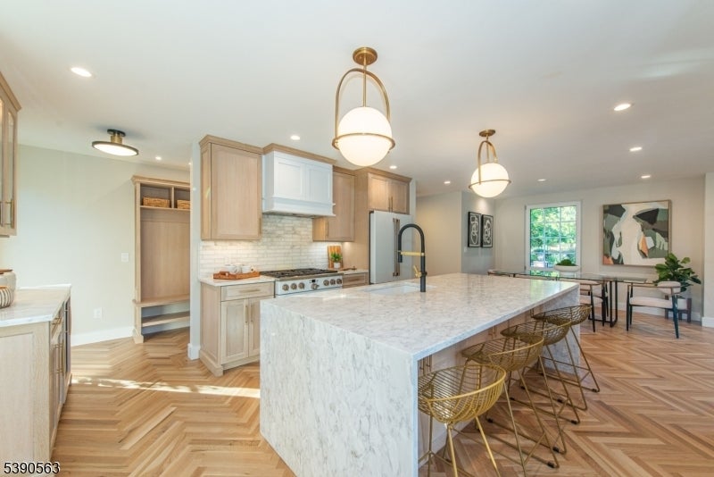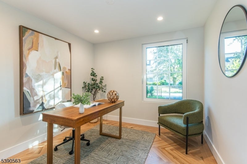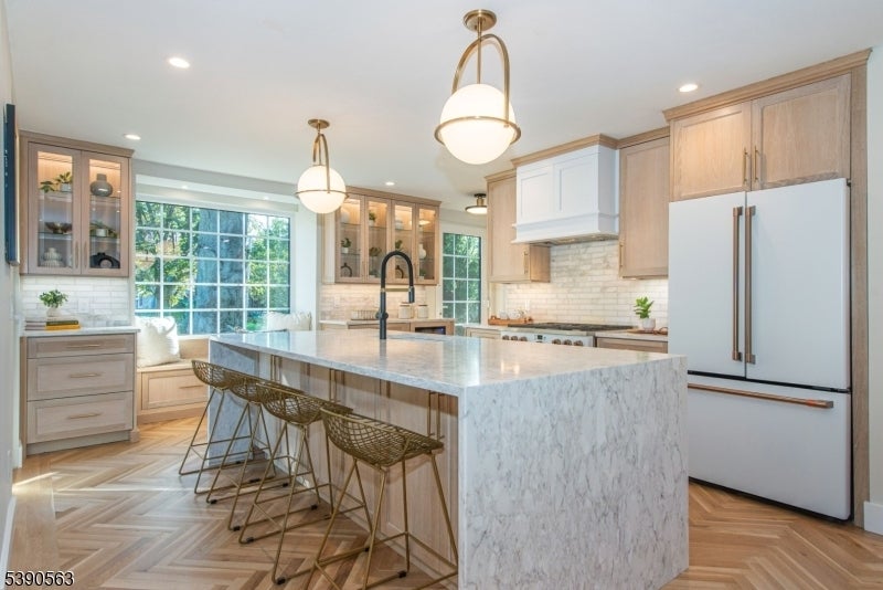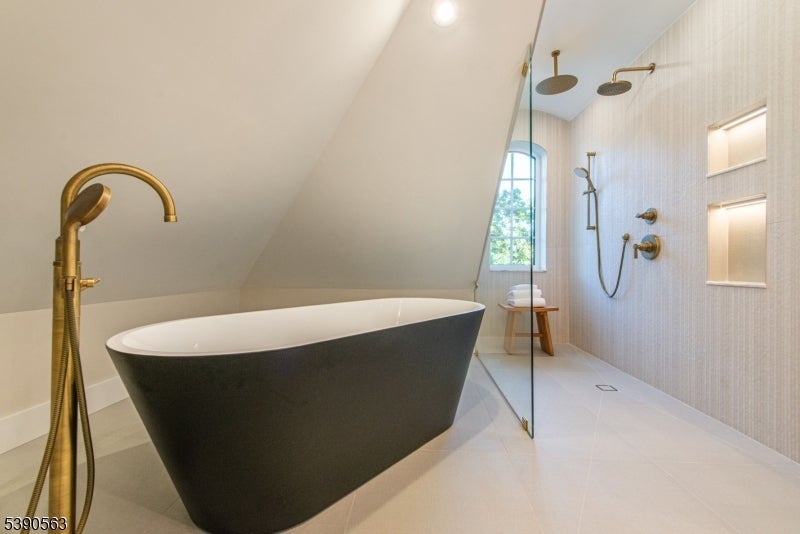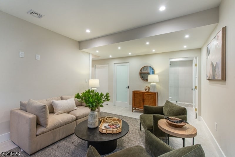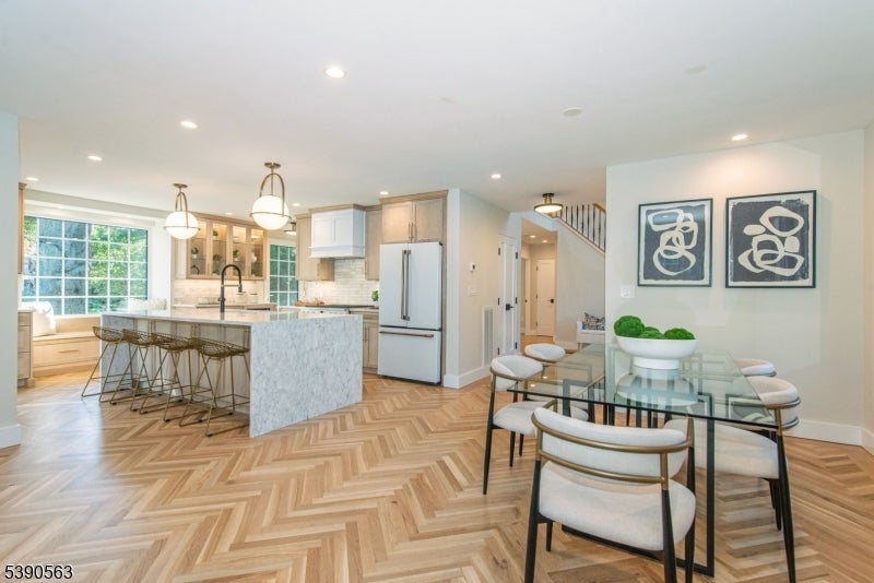Step into timeless elegance with this exceptional residence, nestled in a tranquil neighborhood offering walkability to vibrant downtown Montclair and effortless NYC commute. With the feel of a modern French Chateau, the home blends classic refinement with contemporary luxury. A dramatic two-story foyer welcomes you with an oversized entrance door, curated lighting, and soaring windows that glow at dusk. It features five bedrooms, four full baths and a first-floor powder room. White oak herringbone flooring flows throughout, complementing a bespoke kitchen with custom white oak cabinetry, Calacatta quartz countertops, GE Cafe appliances, and a walk-in pantry. The primary suite is a sanctuary with a spa-inspired bath featuring a walk-in shower for two, rich finishes, a soaking tub, a smart toilet, and a cleverly designed closet. A second-floor loft offers a serene retreat, while the upstairs bedroom is an architectural gem with peaked ceilings, is ideal for a private suite. Distinctive fireplaces, custom built-ins, and refined finishes lend uniqueness to every room. The inviting family room features a custom built-in wet bar, full bath, and dedicated laundry room. From the living rm and kitchen, 3 elegant French doors open to stone patio, curated gardens, newly planted evergreens, and enchanting exterior lighting, perfect for relaxing, watching the seasons change, or entertaining al fresco. This residence is a rare blend of sophistication, serenity, and luxurious living.