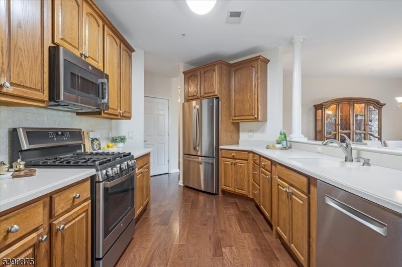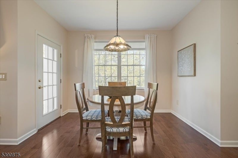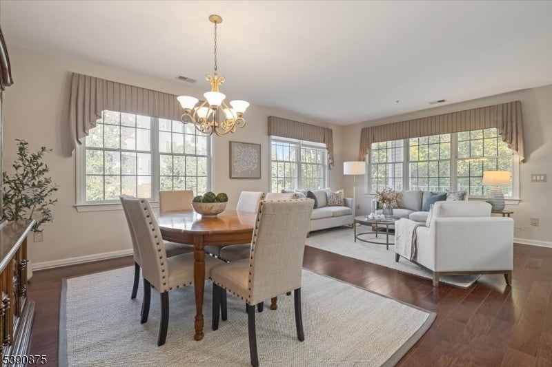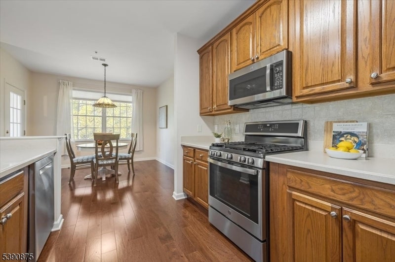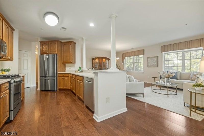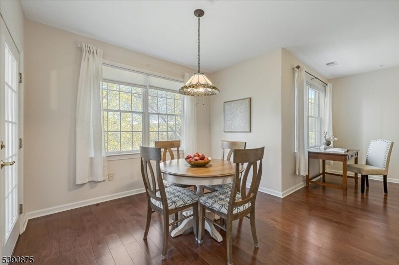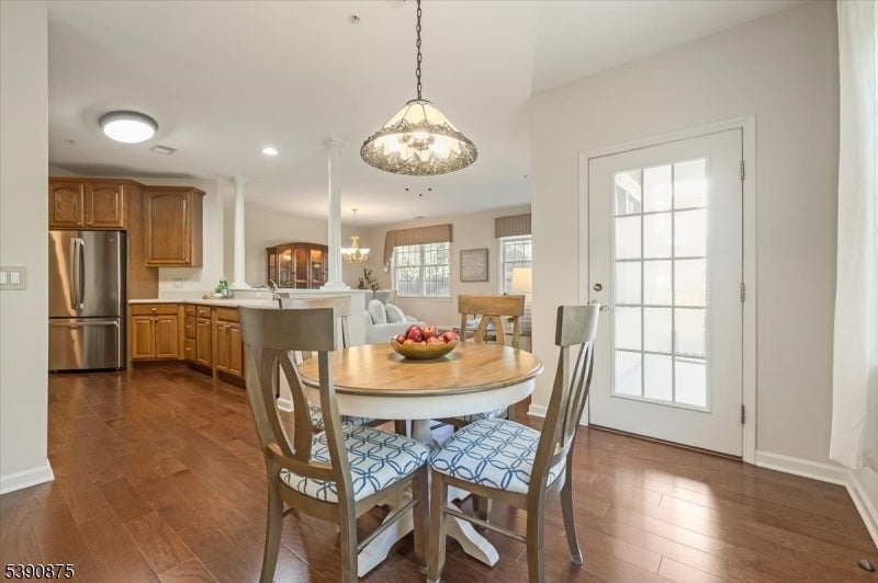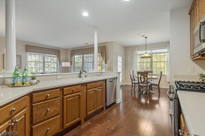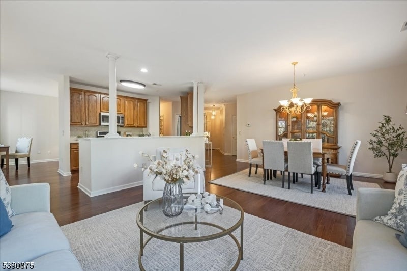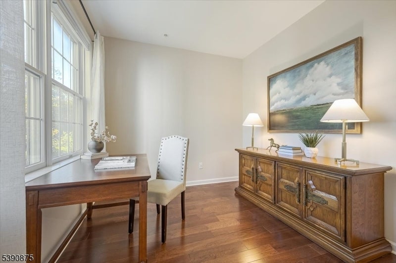 Welcome Home! This stunningly updated end unit sits within the beautiful and highly sought after Horizons at Mount Arlington adult community. Walking into the unit you will find gleaming hardwood floors and large windows throughout with an open concept floor plan. The eat in kitchen opens up to the dining and living room area and also has a generous office space. The primary bedroom is 18x15 and has a large walk in closet. The primary bathroom has a soaking tub and a stall shower. There is also a second bedroom and an additional full bathroom. The end unit has a private balcony that backs to the wooded area of the community making it a serene and calming environment to relax. There is also a private assigned garage space and storage unit with plenty of additional guest parking. The community comes with many amenities such as a walking paths, pool, pickle ball court, bocce ball court and a club house that has a full exercise room, billiard room and a large dining space for events and get togethers. Minutes from main highways, restaurants and shopping make this the perfect location! Newer central air, furnace and hot water heater replaced in 2020. Don't miss it!!