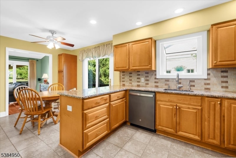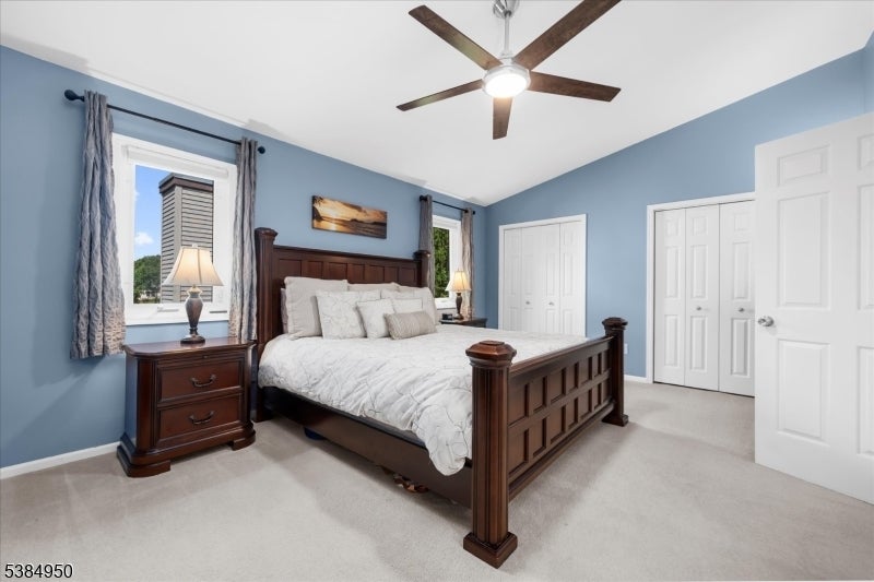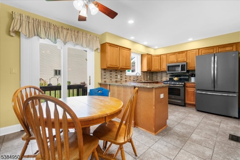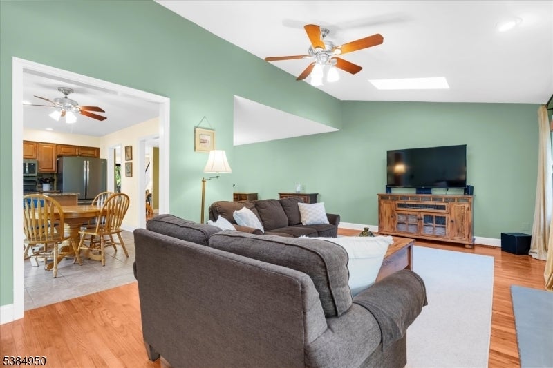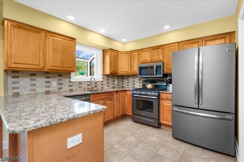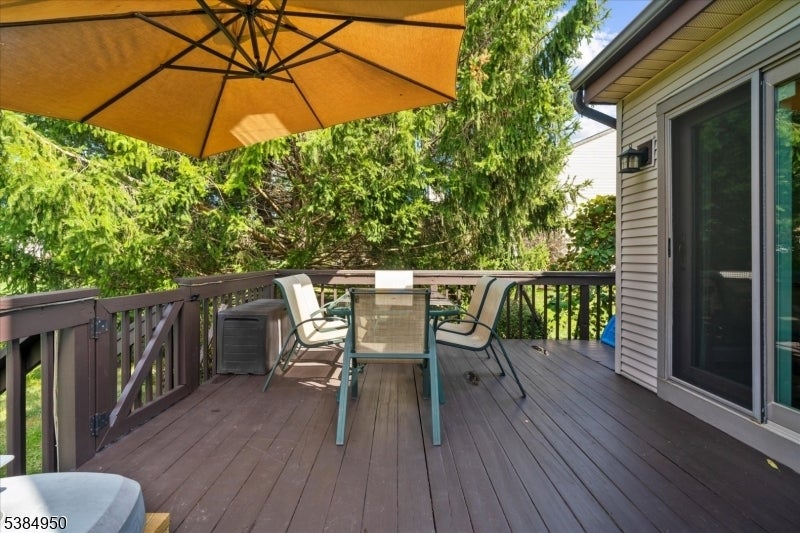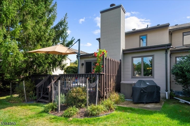 Lovely townhouse end unit that is the largest model in Sun Ridge Complext. Step into the inviting foyer featuring an updated powder room and hall closet. The open floor plan offers an easy flow between the kitchen, dining room, and living room. The kitchen includes granite countertops, a new dishwasher and microwave, newer cabinetry, refrigerator, a charming greenhouse window, and a breakfast area with sliders to the deck. The formal dining room, highlighted by a chandelier, opens into the living room with cathedral ceilings, skylights, and a striking wood-burning stone fireplace. From here, sliders lead to the oversized deck perfect for entertaining or relaxing complete with a dedicated grill area. Upstairs, you'll find two generously sized bedrooms. The primary suite includes a private full bath, while the second full bath that was updated offers a newer toilet, sink and tub/shower. A convenient laundry area with newer washer and dryer is also located on this level. The finished basement provides additional living space with plush carpet, two storage closets, a workshop area (with cabinets included), and a recreation room. The one-car attached garage features a newer door and opener, with shelving that remains for extra storage. This js a pet-friendly community. BEST AND FINAL DUE TUESDAY, OCTOBER 21 AT 3 P.M.