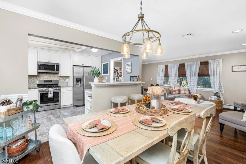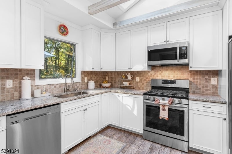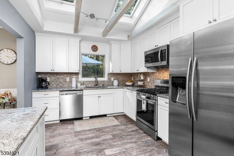 Welcome to the most charming home in the desirable "In the Valley" neighborhood. This beautifully maintained 3-bedroom, 2.5-bath split-level is truly turn-key with upgrades and thoughtful design throughout. The recently renovated kitchen features gleaming granite countertops, stainless steel appliances, and an open layout that flows seamlessly into the dining and living areas. Vaulted ceilings with custom beams, skylights, custom blinds, and wood floors create a warm and inviting atmosphere. Enjoy cozy evenings by the gas fireplace accented with a custom mantle and built-in shelving. The primary suite offers a private retreat with a full bath, while the additional bedrooms provide ample space and natural light. The newly finished basement with electric heat and durable vinyl flooring adds flexible living space, perfect for a home office, gym, or recreation room. Step through sliders to the oversized multi-level deck overlooking a serene, level backyard just over an acre, ideal for entertaining or quiet relaxation. With public utilities, crown molding, recessed lighting, and mature landscaping surrounding the cedar siding and stone veneer fa ade, this home offers unbeatable curb appeal. Located within an excellent school system and close to major routes, shopping, and dining, every detail has been considered. Spacious, inviting, and crafted with care, this split-level home combines comfort and craftsmanship with a feeling you simply can't beat.