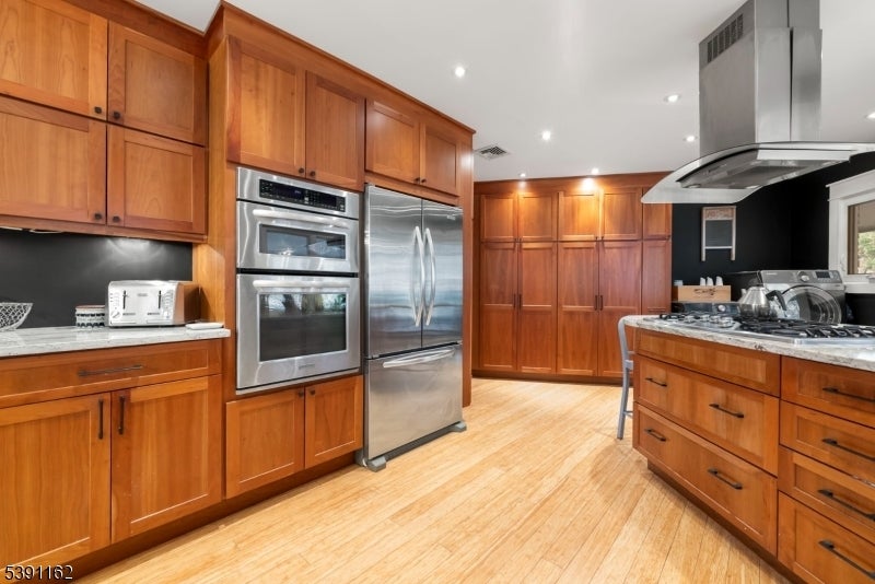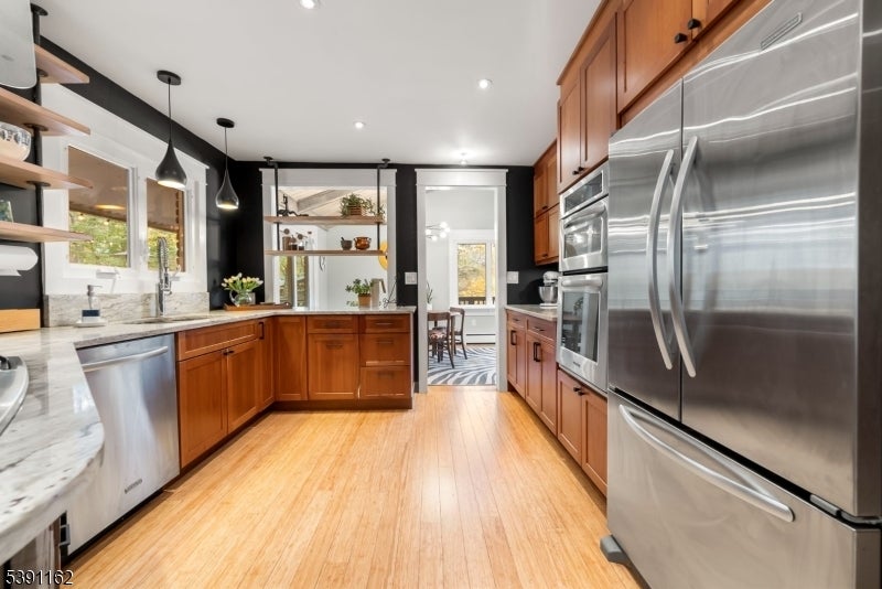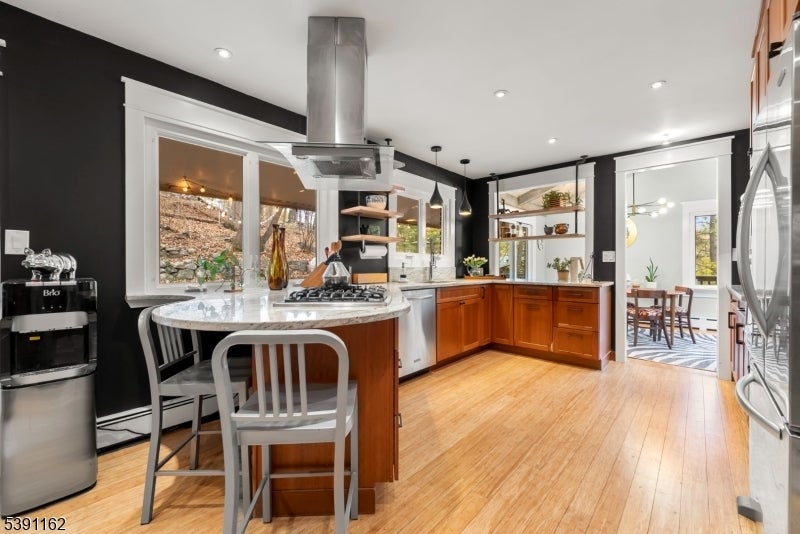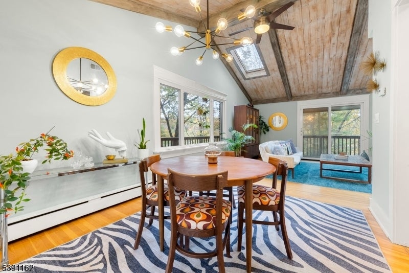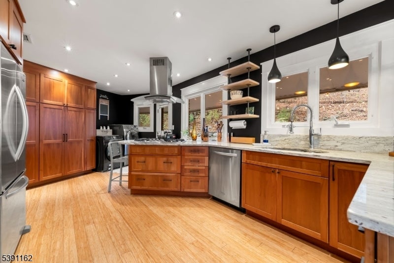 Discover this unique 4-BR, 3-bath home, perfectly positioned on a serene, wooded property in Ringwood, NJ. This 3,400sq.ft. custom raised ranch offers a blend of peaceful retreat and vibrant community living, all just 40 minutes from NYC. Well maintained and major upgrades including central air (2024) New roof with a 50-yr warranty (2025) windows, front doors, 2 car garage doors (2018). 2 Baths redone (2019) First level, In-Law suite updated 2016. The foyer adorns a beautiful corner stone fireplace as you step into the large terracotta tiled family room with massive windows, you will enjoy this large entertainment room and cedar lined wet/dry Sauna w/infrared light too. Upstairs, the kitchen, dining and living room have had a few cosmetic touches, wood floating shelving with ample storage within the kitchen including custom made trim throughout the home. Skylights in the vaulted ceilings with two sliding glass doors to deck add a light, airy feeling to the living room. The primary bedroom includes plenty of room for a sitting area with ensuite bath along with 2 more bedrooms Private, yet not isolated, enjoy community events at the beach club nearby. Morning sunrises on the balcony, overlooking the lake (with unobstructed views in the Fall and winter). On Friday nights, relax on the back deck, make pizza in your brick oven and listen to live bands from the beach community echoing across the 65-acre freshwater lake all summer long. *Check out the 3D Tour!