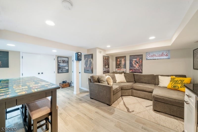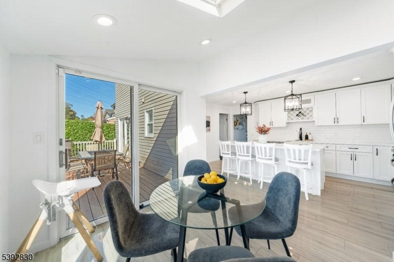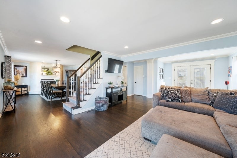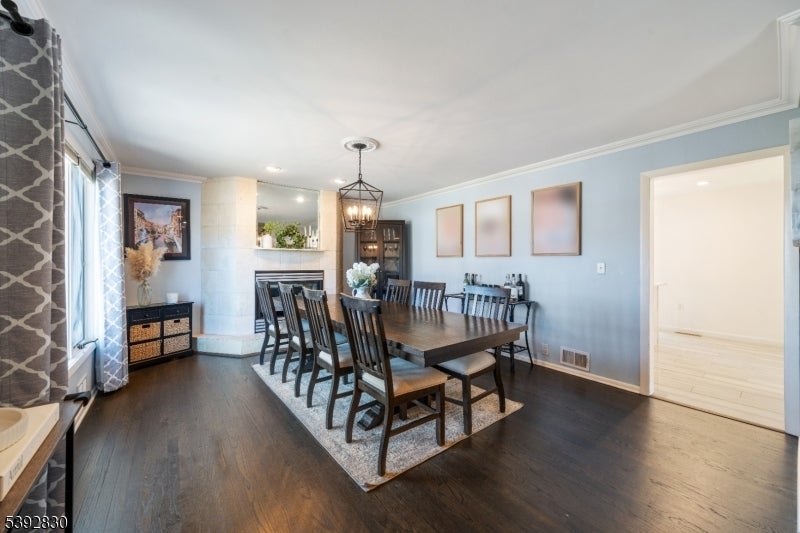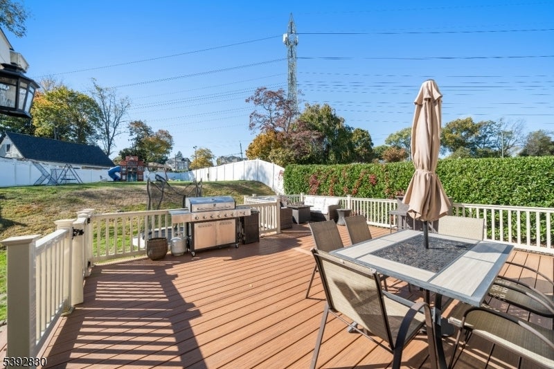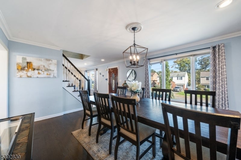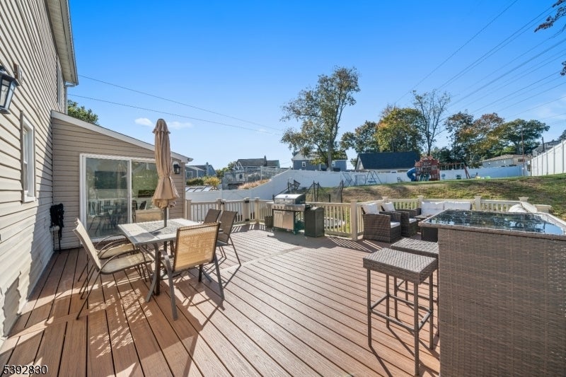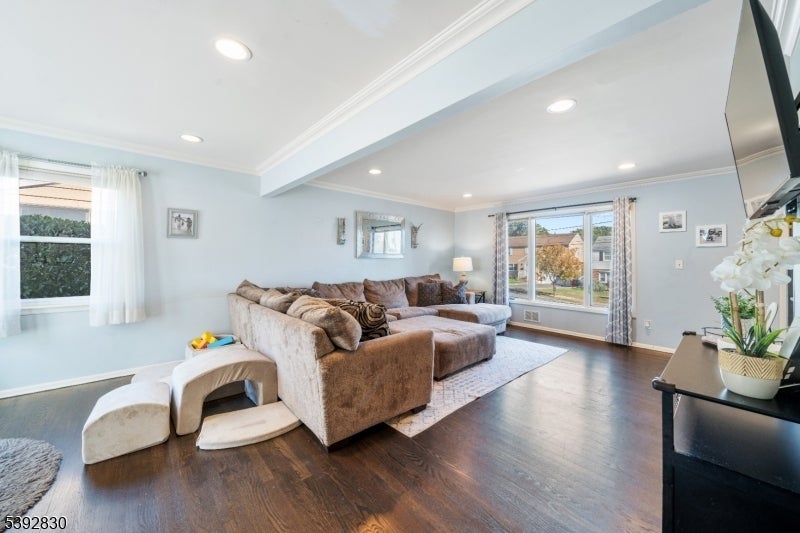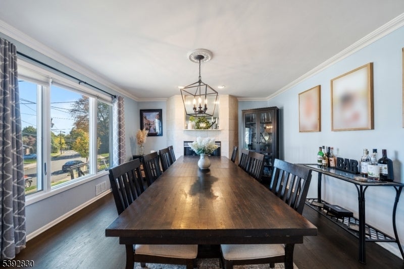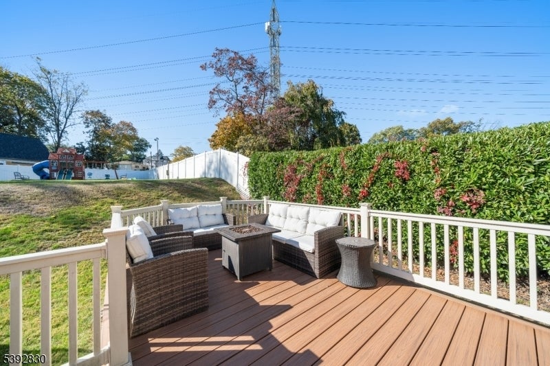 Welcome to this beautifully detailed home nestled on a quiet residential street near a highly rated elementary school. Set on an oversized lot, this property offers incredible space inside and out. Step into a large living room with full bathroom that has an easy walkout to the back deck. Adjacent formal dining room has custom gas fireplace. Each room is enhanced by elegant crown molding and timeless design touches. The updated kitchen impresses with bright white cabinetry, a large island with seating, and a separate dining nook overlooking the expansive backyard. Upstairs, the primary suite features high ceilings, a walk-in closet, and a private bath, while two additional bedrooms share their own bathroom. The finished basement adds even more living space with stylish finishes and a convenient half bath that is ideal for a rec room, gym, or play area. Sliding doors lead to a large Trex deck and a huge, fenced-in yard with plenty of green space for entertaining or relaxing. Easy commute to NYC transportation, ON3 campus and major highways. Move right in and enjoy a home that blends thoughtful detail, modern updates, and that perfect suburban lifestyle.