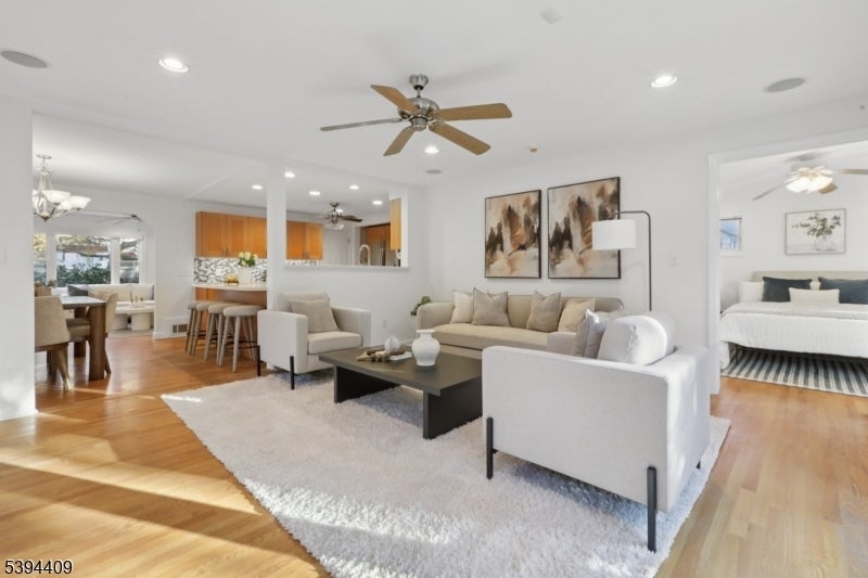 Beautifully renovated and expanded 4-bedroom, 2-bath home with a spacious layout and major upgrades throughout. A substantial addition transformed the home, creating an open-concept kitchen and large family room, a desirable first-floor bedroom, full bath suite with accessibility features, and a second-floor primary bedroom and convenient second-floor laundry. The updated kitchen features wood cabinetry, newer 2023 appliances, and new flooring. Additional upgrades include an expanded double-wide Belgium block driveway, upgraded 200-amp electrical service, network-wired rooms, split two-zone HVAC, energy-efficient blown insulation, and a whole-house fan and water purification system. The finished basement offers 250 sq ft of living space with new flooring and two storage rooms. Exterior highlights include a large fenced-in backyard, paver patio, deck, powered shed with mezzanine storage, new front porch with portico, and front-yard pavers. Tucked at the end of a quiet street near top Livingston schools and town amenities.