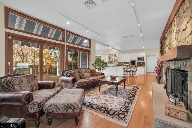 Amazing mountain and sunset views from this sprawling custom built home nestled and backed to protected land in the beautiful gated community of Smoke Rise. Wood floors, crown moldings, two wood-burning fireplaces, built-ins, wet-bar, Anderson windows, retractable awnings, Palladian, picture, garden and transom windows throughout, recessed lighting, cedar closets, built-in speaker system. Over-sized two car garage. Roof 2021. Buderus high-efficiency multi-zone boiler. 2 central units 2019, providing multi-zone cooling.Hot water heater 2023.First level is complete with first floor ensuite and leisure room (perfect for extended living and guests), formal living with adjacent formal dining room (great for entertaining), large eat-in kitchen open to family room, additional full bath, laundry/mud room area with garage entrance, and back stair-case to primary suite with bonus room.Spacious eat-in kitchen with large center island, separate eating area, sliders to deck, stainless steel appliances Second level features palatial primary suite with luxury bath, sitting area, office, vaulted ceiling, two cedar walk-in closets & double door access to private living area.Two additional bedrooms & full bath complete the second level. Enjoy everything that Smoke Rise has to offer with 24 hour security, beach, lake, fishing, boating, clubs, tennis, sports courts/fields, restaurant and more.Continued top-rated school system. Convenient access to major highways, NJ Transit, parks and shopping.