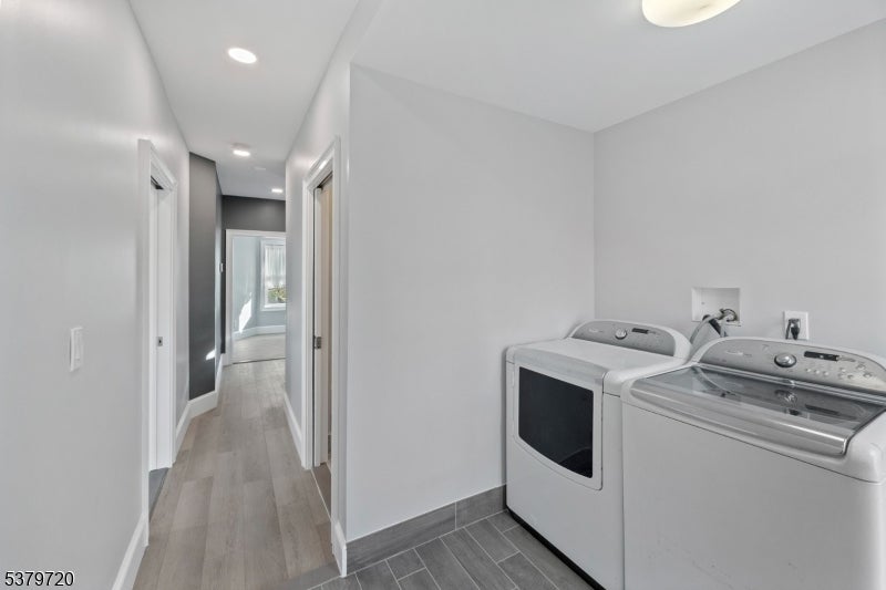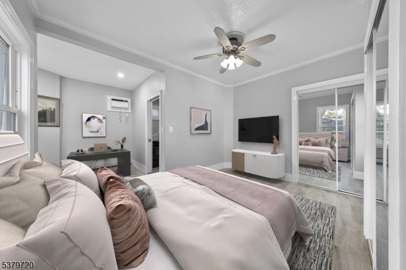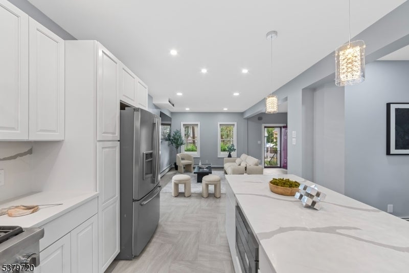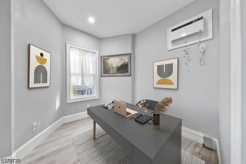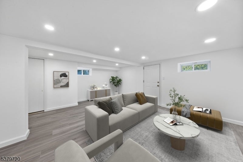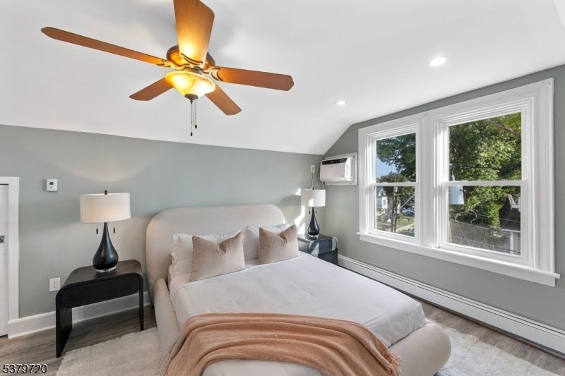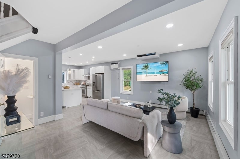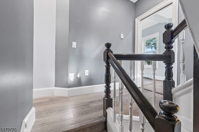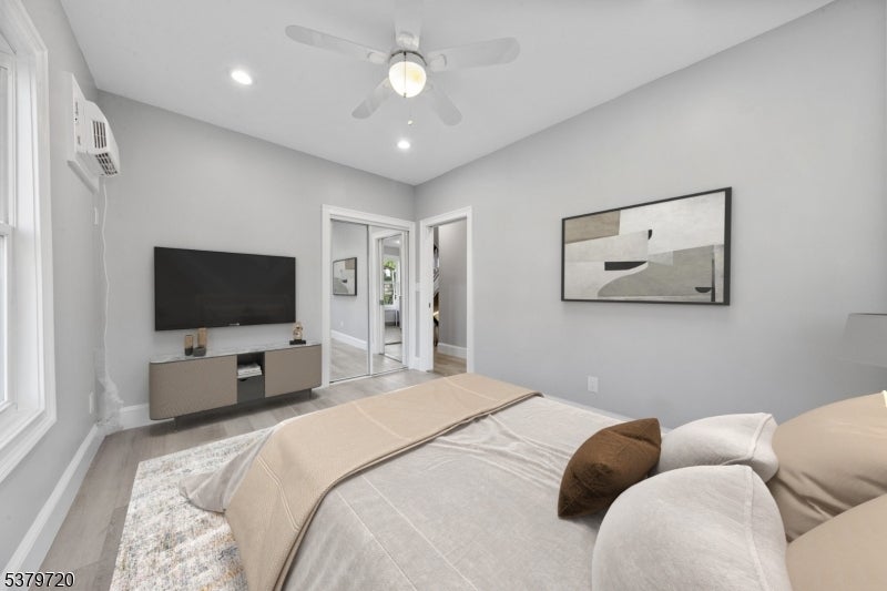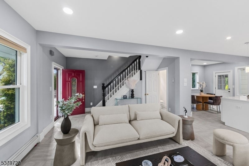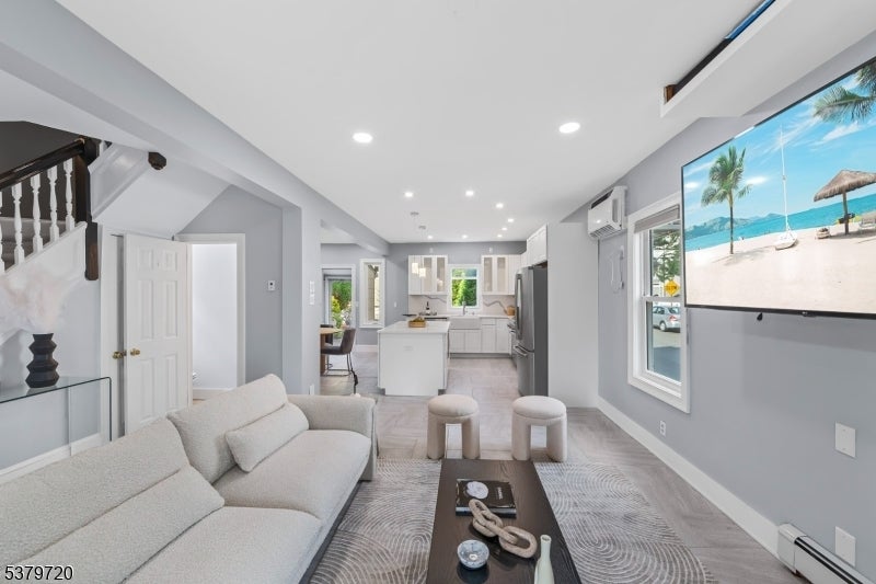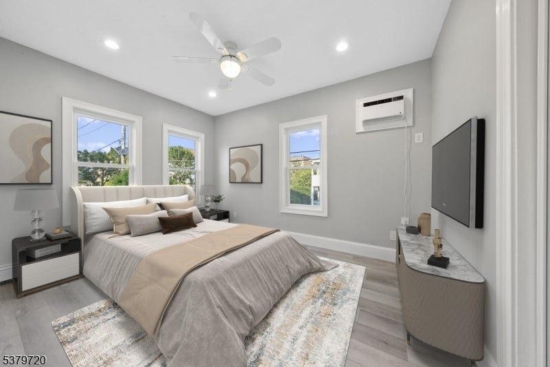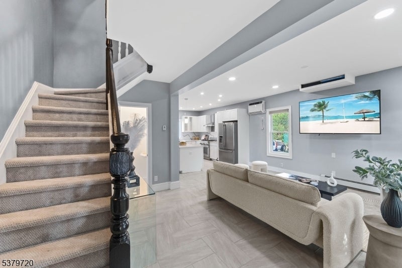 Stunningly renovated in 2025, this home offers four fully finished levels of modern living. The main level features a covered front porch, brand-new kitchen with custom cabinetry, quartz countertops and backsplash, upgraded appliances including a Thermador stove, plus all new flooring, windows, and lighting throughout. The 2nd floor includes two spacious bedrooms, a full bath, and laundry room. The 3rd floor is a private primary bedroom suite with a large walk-in closet. The finished basement, with its own entrance, adds versatile living space. Major updates include upgraded electric service and a roof replaced in 2015. Each floor has its own heating zone and built-in A/C. Outside, enjoy a fenced private yard with maintenance-free artificial grass, professional landscaping, storage shed, and a double-wide driveway for 4+ cars. cat 6 prewiring and main level TV included.