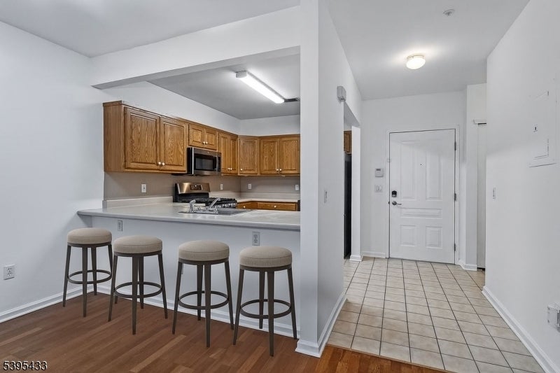 Welcome home to Fox Hills, a 55+ active adult gated community conveniently located right off Route 80 in Rockaway. This one-bedroom residence in the Monroe building is directly across from the Clubhouse, offering a plethora of amazing amenities: an indoor & outdoor pool, tennis & pickleball courts, bocce ball, a gym, card room, yoga/ballet studio, crafting room, screening room, library, meeting room, and even a ballroom. A foyer leads to an open kitchen, stainless steel appliances, with a breakfast bar overlooking a living/dining room combination with wood flooring. The bedroom with wood floors boasts a walk-in closet and is en suite to a full bath featuring a stall shower, as well as a stackable washer/dryer. A coat closet/pantry and utility closet complete the home. One car garage space #31 and a storage bin, additional parking available outside. Conveniently located close to the Rockaway Mall, restaurants, and transportation. Free shuttle bus to stores & shops. Relax and enjoy your new maintenance-free lifestyle!
