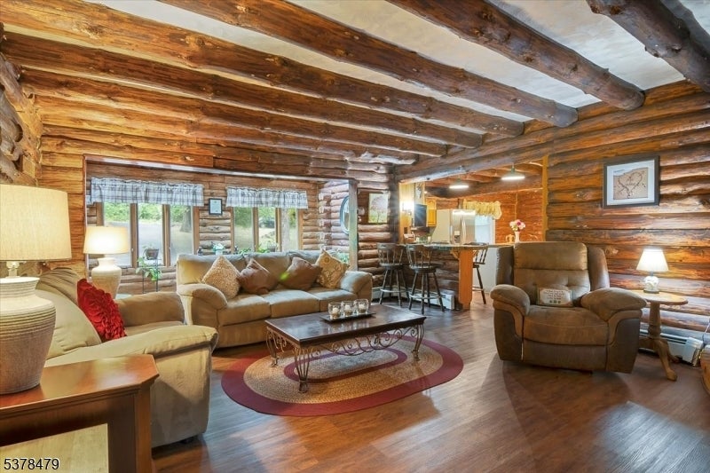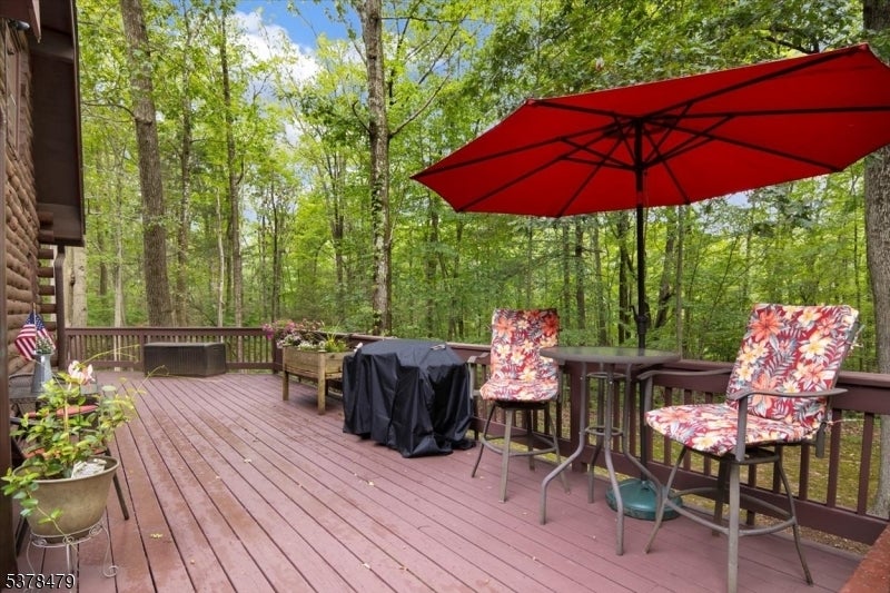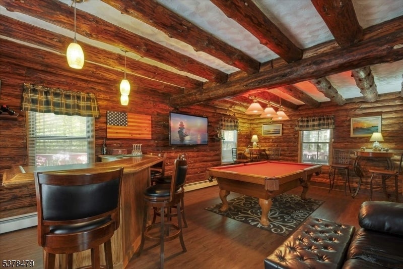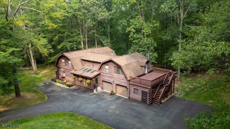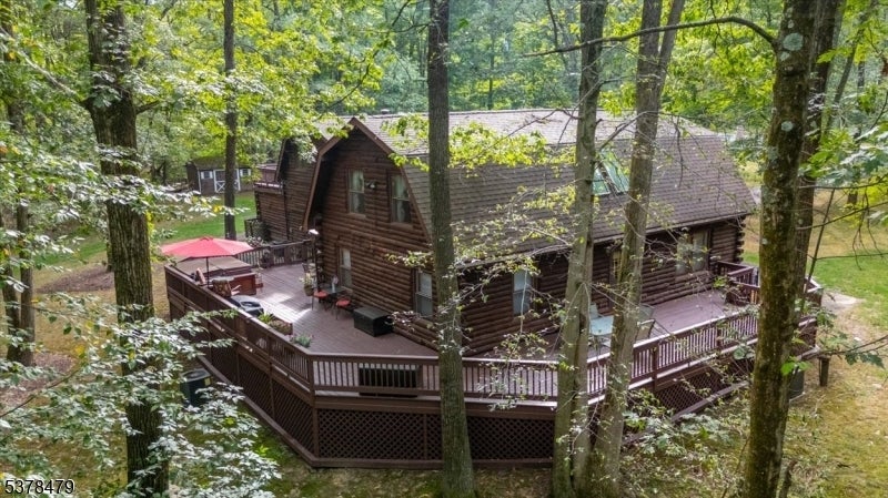 Experience the unique opportunity to own this well-maintained log home, perfectly set on 2.2 acres of secluded land, offering exceptional privacy. Step inside to a passive solar room filled with natural light, seamlessly flowing into a cozy living room with a wood-burning stove. This inviting space extends to a wrap-around deck, where you can unwind in the hot tub. The deck and backyard create an idyllic setting for entertaining with summer BBQs or simply soaking in the tranquil surroundings. The generously sized kitchen is a chef's delight, featuring a breakfast bar, newly built butcher block island, and open layout to the dining area, perfect for gatherings. Additional living space is found in the billiard room, complete with a custom bar, ideal for hosting. This versatile home offers 2 kitchens, 4 bedrooms, 2 full baths, and a half bath. It can function as a spacious 4-bedroom residence or be adapted into a separate in-law suite with 2 bedrooms, bathroom, living room, kitchen, and private deck entrance. Modern comfort is ensured with 4-zone heating and 3-zone A/C. The property also includes a 2-car garage with workshop area, perfect for projects and storage. Recent updates include new roof (3 years), newer skylights, paved driveway, hot water heater, and new hot tub replaced August 2025. Located in sought-after Rockaway Township, this home offers the perfect blend of privacy and convenience near hiking, fishing, shopping, dining, top-rated schools, and Routes 80, 23 & 46.