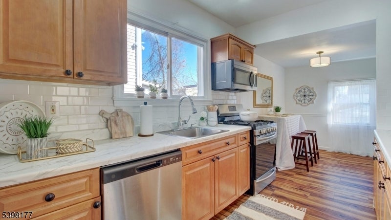Welcome to this charming, move-in ready home nestled on a quiet dead-end street in one of Bloomfield's most sought after neighborhoods. Conveniently located near parks, schools, dining, shopping, major highways and NYC transportation. Step inside to a freshly painted, light-filled 3 bedroom, 1 1/2 bath home featuring a warm and inviting front porch, perfect for morning coffee or relaxing evenings. The bright living room welcomes you with wood floors and a cozy wood burning fireplace, flowing seamlessly into the dining room ideal for both everyday living and easy entertaining. The modern, updated eat-in kitchen is a standout, complete with stainless steel appliances, timeless subway tile backsplash, recessed lighting and direct access to the private backyard- a perfect setting for gatherings, gardening, grilling and relaxation. Two generously sized bedrooms and hall full bathroom complete the main floor. The entire second level offers a spacious primary bedroom retreat featuring a sitting area, a walk-in closet and a convenient half bath and plentiful storage. The expansive full unfinished basement includes a laundry room, tons of storage and endless possibilities - ideal for creating a recreation room, gym or home office. With charm, updates, space, and a prime location, this Bloomfield home is truly a wonderful place to call home.