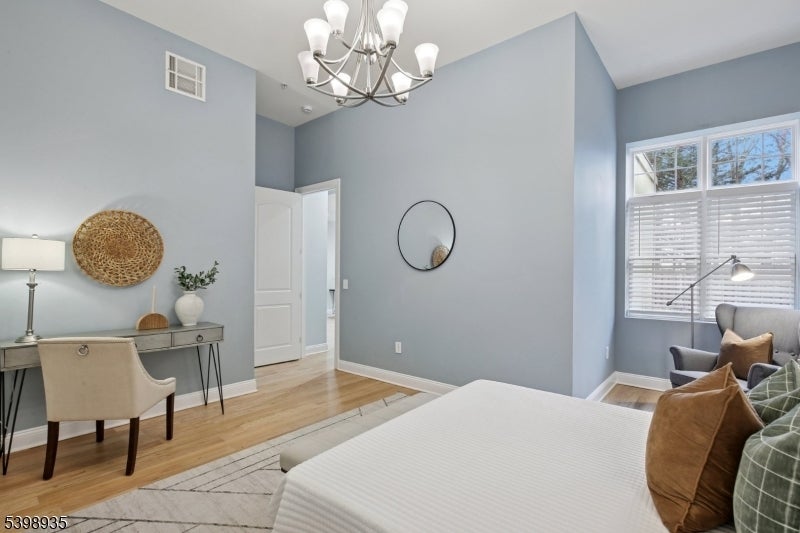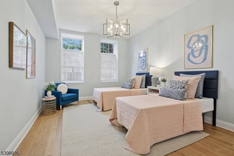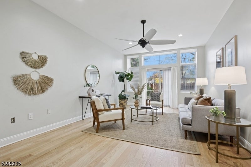 Modern living abounds in this newly renovated, sun drenched, first floor, loft style condo. An open floorplan coupled with exceptionally high ceilings, large windows allowing in extraordinary light, and freshly refinished oak flooring throughout gives this special unit an impressive feeling of light and spaciousness. The kitchen has been reimagined with a stunning marble backsplash set in a sophisticated herringbone pattern, new quartz countertops, and a suite of matte white GE Cafe appliances with brushed bronze hardware. Opening out from the kitchen breakfast bar, the living/dining area is open and welcoming to simple relaxation or robust entertaining. Two large bedrooms flank the luxurious main bath with marble tile floor and walls, and a walk-in shower tiled in gorgeous marine blue ceramic tile with brass rain head shower and handheld wand. The extra-large primary bedroom has a special reading nook and two large, fully customized walk-in closets. Second bedroom is also large with its own customized closet and soaring ceilings. Central air conditioning. Laundry in unit. Two assigned parking spots in dedicated lot. Convenient to Bloomfield Center, Montclair, Montclair State University, GSP and more. Pets welcome.